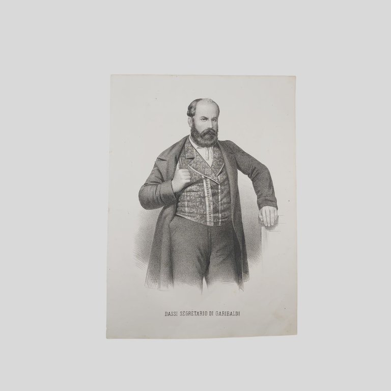Litografia originale su carta, tratta da Domenico Valente, Storia della guerra di Sicilia, Napoli, 1862. Tavola sciolta, cm 35×25. Naturali tracce d’uso, in buone condizioni. Litografia originale raffigurante Dassi segretario di Giuseppe Garibaldi. La tavola è tratta dall’opera di Domenico Valente, Storia dell’Italia centrale dopo la pace di Zurigo e della guerra di Sicilia e dei fatti posteriori, Napoli, A. Morelli, 1862. Una delle più importanti testimonianze iconografiche e narrative degli eventi legati alla spedizione dei Mille e alla successiva integrazione della Sicilia nel Regno d’Italia. Il ritratto, realizzato secondo il gusto ottocentesco, restituisce un’immagine ufficiale e celebrativa del personaggio, sottolineandone il ruolo istituzionale, militare o politico all’interno del processo risorgimentale. Si tratta di una stampa originale dell’epoca, non di una riproduzione moderna, destinata in origine alla consultazione e alla divulgazione storica, oggi apprezzata come documento collezionistico e iconografico. Esemplare di sicuro interesse per collezionisti di Risorgimento italiano, storia militare, iconografia ottocentesca e per studiosi del processo di unificazione nazionale.