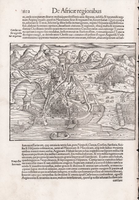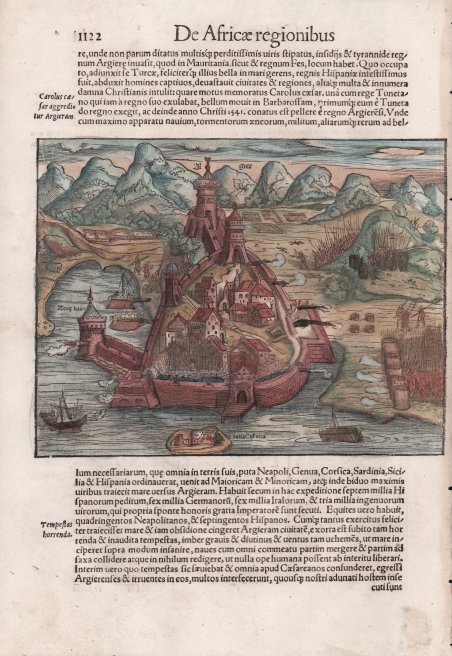 Tavola tratta dalla ' Cosmographiae Universalis, edizione in latino, Basilea, metà del XVI secolo.La ' Cosmographiae Universalis ' di Sebastian Münster (1488-1552), stampata per la prima volta Basilea nel 1544 dall’editore Heinrich Petri, venne più volte aggiornata e aumentata di nuove carte geografiche e rappresentazioni urbane nelle sue numerose edizioni che arrivano all’inizio del secolo successivo. Münster aveva lavorato a raccogliere informazioni al fine di ottenere un'opera che non deludesse le aspettative e, dopo un'ulteriore pubblicazione in tedesco abbellita da 910 stampe su legno, giunse nel 1550 all'edizione definitiva in latino, illustrata da 970 silografie. Vi furono poi numerose edizioni in diverse lingue, fra cui latino, francese, italiano, inglese e ceco. Dopo la sua morte di Münster (1552), Heinrich Petri prima, e il figlio Sebastian poi, continuarono la pubblicazione dell’opera. La ' Cosmographia universalis ' fu uno dei libri più popolari e di successo del XVI secolo, e vide ben 24 edizioni in 100 anni: l'ultima edizione tedesca venne pubblicata nel 1628, molto tempo dopo la morte dell'autore. La ' Cosmographia ' conteneva non solo le ultime mappe e vedute di tutte le città più famose, ma anche una serie di notizie enciclopediche di dettagli relative al mondo conosciuto, e sconosciuto. Il particolare successo anche commerciale di quest'opera fu dovuto in parte alle belle incisioni (tra i cui autori si possono citate Hans Holbein il Giovane, Urs Graf, Hans Rudolph Manuel Deutsch, David Kandel). Silografia, ' finemente colorata a mano, in buone condizioni. Plate taken from the ' Cosmographiae Universalis, Latinn edition, Basel, half of the 16th Century. The ' Cosmographiae Universalis ' of Sebastian Münster (1488-1552), printed for the first time in Basel in 1544 by the publisher Heinrich Petri, was updated several times and increased with new maps and urban representations in its many editions until the beginning of the next century. Münster had worked to collect information in order to obtain a work that did not disappoint expectations and, after a further publication in German embellished with 910 woodblock prints, arrived in 1550 to the final edition in Latin, illustrated by 970 woodcuts. There were then numerous editions in different languages, including Latin, French, Italian, English and Czech. After his death in Münster (1552), Heinrich Petri first, and then his son Sebastian, continued the publication of the work. The ' Cosmographia universalis ' was one of the most popular and successful books of the 16th century, and saw as many as 24 editions in 100 years: the last German edition was published in 1628, long after the author's death. The ' Cosmographia ' contained not only the latest maps and views of all the most famous cities, but also a series of encyclopedic details related to the known, and unknown, world. The particular commercial success of this work was due in part to the beautiful engravings (among whose authors can be mentioned Hans Holbein the Younger, Urs Graf, Hans Rudolph Manuel Deutsch, David Kandel). Woodcut, fine later hand colour, in good condition. Cfr.
