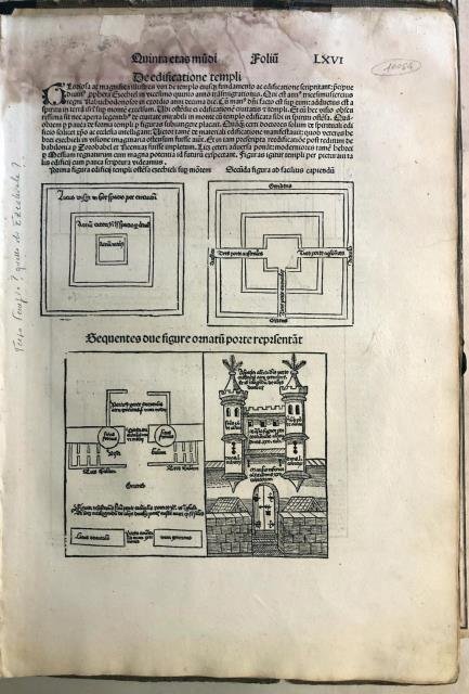 Dal “Liber Chronicarum Nurembergensi”, Norimberga, 1493. Fogli LXVI e LXVII. Xilografie stampate su doppia pagina (due fogli e quattro pagine), b/n, cm 47,5 x 65 circa (il foglio). Al recto e al verso della prima metà sono raffigurate le piante del Terzo Tempio, o Tempio di Ezechiele, un tempio sacro del popolo ebraico, descritto architetturalmente e profetizzato da Ezechiele come un edificio eterno, dimora del Dio di Israele, costruito sul Monte del primo tempio di Gerusalemme; al verso della seconda metà è raffigurata una pianta per intero dell'interno. Storicamente: il Tempio di Salomone a Gerusalemme fu forse il primo tempio ebraico costruito in pietra, poi distrutto da Nabucodonosor II (questo tempio è anche un importante costituente della Massoneria e dei Rosacroce, per le quali dottrine esiste una chiara relazione con il Tempio di Salomone). Dopo la cattività babilonese fu costruito un secondo tempio, al quale mancava la parte più sacra, l'Arca dell'Alleanza, scomparsa dopo la distruzione del primo tempio; il secondo tempio fu distrutto dai Romani e oggi resta solo la parte del muro del tempio nota come il Muro del Pianto. Poi fu costruito il Terzo Tempio, detto anche Tempio di Ezechiele. Foglio interessato da leggera presenza rosso - violacea , il cosiddetto fungo rosso, ma al solo margine superiore, peraltro ben impresso e in buono stato di conservazione. .