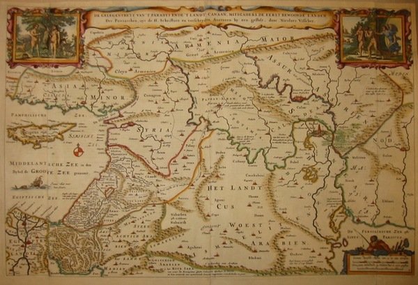 Carta geografica (cm. 47,5x31,5) tratta da un’edizione di una Bibbia in lingua olandese. Raffinata coloritura all’acquerello. Retro foderato e leggere imperfezioni dovute alle piegature preesistenti: nel complesso bell’esemplare. L’Eden o Paradiso Terrestre in questa, come in altre simili carte, nei pressi dell’antica città di Babel (Babilonia) nell’odierno Iraq. Nel primo inserto sono raffigurati Adamo ed Eva nel Giardino dell’Eden e nel secondo la loro cacciata successivamente al peccato originale.