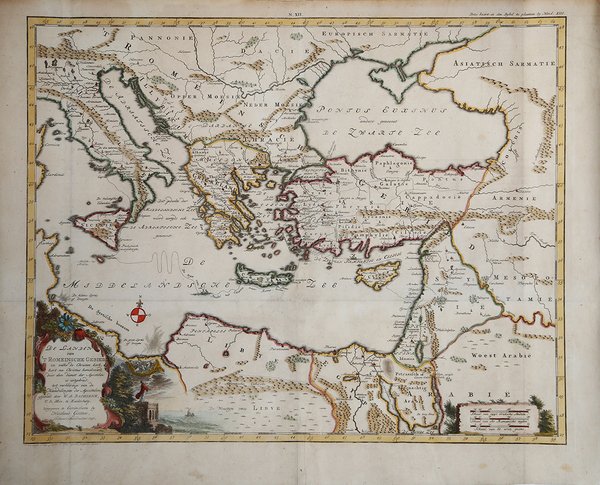Bella mappa della parte orientale del Mediterraneo con la traccia del viaggio di San Paolo da Ceasarea a Roma. Il cartiglio del titolo illustra la visione di San Paolo.Incisione in rame, bella coloritura, in ottimo stato di conservazione.Inciso da Jan van Jagen e pubblicato in un'edizione olandese della Bibbia da Nicolas Goetzee. A nice map of the eastern part of the Mediterranean with the track of St. Paul's voyage from Ceasarea to Rome. The title cartouche illustrates the vision of St. Paul.Copperplate with fine later hand colour, very good condition.Engraved by Jan van Jagen and published in a Dutch Bible by Nicolas Goetzee. Cfr.