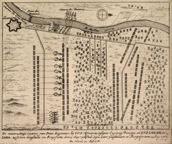 De roemruchtige victorie van Prins eugenius, by Luzzara tusschen Guastalla en Borgoforte de 15 Aug 1702. (ripetuto in latino)