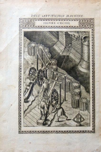 1585. Incisione in rame all'acquaforte, b/n, cm 23 x 34,5 (il foglio). Uniforme ingiallimento, buona impressione e buono lo stato di conservazione. Agostino Ramelli (Ponte Tresa, 1531 - 1608) è stato un ingegnere italiano del XVI secolo. La sua fama gli deriva dalla sua unica opera pubblicata: "Le diverse et artificiose machine del Capitano Agostino Ramelli Dal Ponte Della Tresia Ingegniero del Christianissimo Re di Francia et di Pollonia: nelle quali si contengono uarij et industriosi Mouimenti, degni digrandißima speculatione, per cauarne beneficio infinito in ogni sorte d'operatione". L'opera, dedicata al re di Francia, pubblicata a Parigi nel 1588, consiste di 195 capitoli, ciascuno dei quali contiene l'illustrazione e la descrizione, in francese e in italiano, di una diversa macchina. Si tratta nella maggioranza dei casi di macchine per il sollevamento dell'acqua (norie, viti di Archimede e soprattutto una grande varietà di pompe), ma sono presenti anche vari tipi di mulini, seghe idrauliche e altre macchine azionate dalla forza dell'acqua, nonché gru, fontane e strumenti di interesse bellico. Tra questi ultimi un rivoluzionario carro armato anfibio la cui struttura, costituita da assi di legno, era a tenuta stagna. Quando si muoveva su terreno utilizzava quattro ruote normali, mentre se doveva attraversare dei corsi d'acqua usava due ruote a pale, manovrate a braccia. Recentemente è divenuta popolare la ruota di libri, ossia una sorta di leggio rotante per consentire la contemporanea consultazione di più testi, che pur essendo forse la meno utile delle 195 macchine, è stata considerata da qualcuno una prefigurazione dei moderni sistemi ipertestuali. Le macchine di Ramelli usano tutti i tipi di ingranaggi che sarebbero stati usati nei secoli successivi e vari tipi di valvole. Il "Theatrum machinarum" pubblicato da Jacob Leupold dal 1724 al 1739, che a suo volta costituì la principale fonte della scuola meccanica di Gaspard Monge, dipende ancora in larga misura dall'opera di Ramelli. Poiché nell'opera mancano completamente illustrazioni di fortificazioni, che costituivano il principale interesse professionale dell'autore, probabilmente Ramelli intendeva dedicare loro un altro libro. L'unica altra opera nota di Ramelli è un manoscritto inedito e incompleto dedicato alla descrizione di un elaborato strumento per il rilevamento. Il manoscritto ne descrive anche possibili usi militari. € 100.