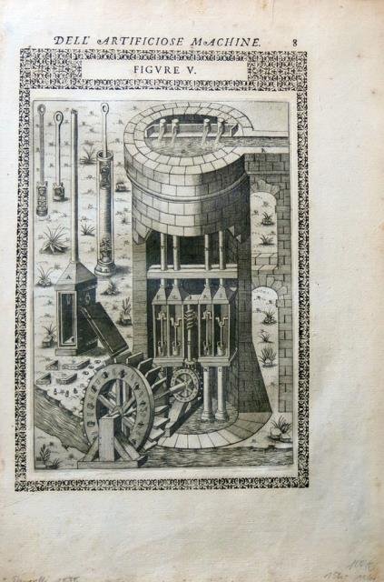 1585. Incisione in rame all'acquaforte, b/n, cm 23 x 34,5 (il foglio). Lievissimo ingiallimento, minime fioriture, buona impressione, buono lo stato di conservazione. Agostino Ramelli (Ponte Tresa, 1531 - 1608) è stato un ingegnere italiano del XVI secolo. La sua fama gli deriva dalla sua unica opera pubblicata: "Le diverse et artificiose machine del Capitano Agostino Ramelli Dal Ponte Della Tresia Ingegniero del Christianissimo Re di Francia et di Pollonia: nelle quali si contengono uarij et industriosi Mouimenti, degni digrandißima speculatione, per cauarne beneficio infinito in ogni sorte d'operatione". L'opera, dedicata al re di Francia, pubblicata a Parigi nel 1588, consiste di 195 capitoli, ciascuno dei quali contiene l'illustrazione e la descrizione, in francese e in italiano, di una diversa macchina. Si tratta nella maggioranza dei casi di macchine per il sollevamento dell'acqua (norie, viti di Archimede e soprattutto una grande varietà di pompe), ma sono presenti anche vari tipi di mulini, seghe idrauliche e altre macchine azionate dalla forza dell'acqua, nonché gru, fontane e strumenti di interesse bellico. Tra questi ultimi un rivoluzionario carro armato anfibio la cui struttura, costituita da assi di legno, era a tenuta stagna. Quando si muoveva su terreno utilizzava quattro ruote normali, mentre se doveva attraversare dei corsi d'acqua usava due ruote a pale, manovrate a braccia. Recentemente è divenuta popolare la ruota di libri, ossia una sorta di leggio rotante per consentire la contemporanea consultazione di più testi, che pur essendo forse la meno utile delle 195 macchine, è stata considerata da qualcuno una prefigurazione dei moderni sistemi ipertestuali. Le macchine di Ramelli usano tutti i tipi di ingranaggi che sarebbero stati usati nei secoli successivi e vari tipi di valvole. Il "Theatrum machinarum" pubblicato da Jacob Leupold dal 1724 al 1739, che a suo volta costituì la principale fonte della scuola meccanica di Gaspard Monge, dipende ancora in larga misura dall'opera di Ramelli. Poiché nell'opera mancano completamente illustrazioni di fortificazioni, che costituivano il principale interesse professionale dell'autore, probabilmente Ramelli intendeva dedicare loro un altro libro. L'unica altra opera nota di Ramelli è un manoscritto inedito e incompleto dedicato alla descrizione di un elaborato strumento per il rilevamento. Il manoscritto ne descrive anche possibili usi militari.