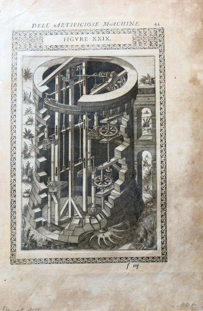 1585. Incisione in rame all'acquaforte, b/n, cm 23 x 34,5 (il foglio). Ingiallimento con aloni più evidenti, un po' irregolare il margine dell'attaccatura al volume, buona impressione e discreto lo stato di conservazione. Agostino Ramelli (Ponte Tresa, 1531 - 1608) è stato un ingegnere italiano del XVI secolo. La sua fama gli deriva dalla sua unica opera pubblicata: "Le diverse et artificiose machine del Capitano Agostino Ramelli Dal Ponte Della Tresia Ingegniero del Christianissimo Re di Francia et di Pollonia: nelle quali si contengono uarij et industriosi Mouimenti, degni digrandißima speculatione, per cauarne beneficio infinito in ogni sorte d'operatione". L'opera, dedicata al re di Francia, pubblicata a Parigi nel 1588, consiste di 195 capitoli, ciascuno dei quali contiene l'illustrazione e la descrizione, in francese e in italiano, di una diversa macchina. Si tratta nella maggioranza dei casi di macchine per il sollevamento dell'acqua (norie, viti di Archimede e soprattutto una grande varietà di pompe), ma sono presenti anche vari tipi di mulini, seghe idrauliche e altre macchine azionate dalla forza dell'acqua, nonché gru, fontane e strumenti di interesse bellico. Tra questi ultimi un rivoluzionario carro armato anfibio la cui struttura, costituita da assi di legno, era a tenuta stagna. Quando si muoveva su terreno utilizzava quattro ruote normali, mentre se doveva attraversare dei corsi d'acqua usava due ruote a pale, manovrate a braccia. Recentemente è divenuta popolare la ruota di libri, ossia una sorta di leggio rotante per consentire la contemporanea consultazione di più testi, che pur essendo forse la meno utile delle 195 macchine, è stata considerata da qualcuno una prefigurazione dei moderni sistemi ipertestuali. Le macchine di Ramelli usano tutti i tipi di ingranaggi che sarebbero stati usati nei secoli successivi e vari tipi di valvole. Il "Theatrum machinarum" pubblicato da Jacob Leupold dal 1724 al 1739, che a suo volta costituì la principale fonte della scuola meccanica di Gaspard Monge, dipende ancora in larga misura dall'opera di Ramelli. Poiché nell'opera mancano completamente illustrazioni di fortificazioni, che costituivano il principale interesse professionale dell'autore, probabilmente Ramelli intendeva dedicare loro un altro libro. L'unica altra opera nota di Ramelli è un manoscritto inedito e incompleto dedicato alla descrizione di un elaborato strumento per il rilevamento. Il manoscritto ne descrive anche possibili usi militari.