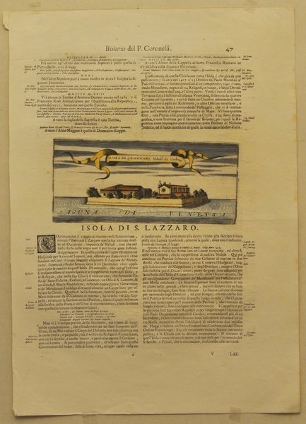 Incisione calcografica di mm 187 x 122 su foglio di mm 460 x 360 in lieve coloritura d'epoca. Nel carteggio :"Isola di S. Clemente". Proveniente dal "Isolario, descrittione geografico-historica, sacro-profana, antico-moderna, politica, naturale, e poetica. Mari, golfi, seni, piagge, porti, barche, pesche, promontorj, monti, boschi, fiumi . ed ogni piu esatta notitia di tutte l'isole coll'osservationi degli scogli sirti, scagni, e secche del globo terracqueo. Aggiuntivi anche i ritratti de' dominatori di esse. Ornato di trecento-dieci tavole geografiche, topografiche, corografiche, iconografiche, scenografiche . a' maggiore dilucidatione, ed uso della navigatione, et in supplimento dei 14 volumi del Bleau. Tomo II. dell'Atlante veneto. Opera, e studio del p. maestro Vincenzo Coronelli .". (P. 49). Tutto il resto della pagina edil retro è occupato dalla storia a partire dalle origini, dell'isola. E. Armao, Vincenzo Coronelli p.116-124; E.A. Cicogna, Saggio di bibliografia veneziana p.617-618 n.4588; NUC pre-1956 v.123 p.316; Un intellettuale europeo e il suo universo . a cura di M.G. Tavoni p.219