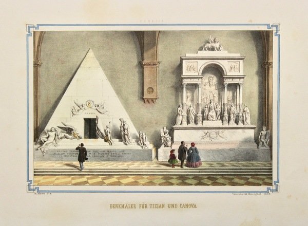 Litografia, eseguita da Giovanni Brizeghel su soggetto di Marco Moro, in finissima coloritura d'epoca. Mm 188x290 (la sola immagine). Perfettamente conservata con ampi margini, eccetto lievi fioriture ai margini.<BR><BR>