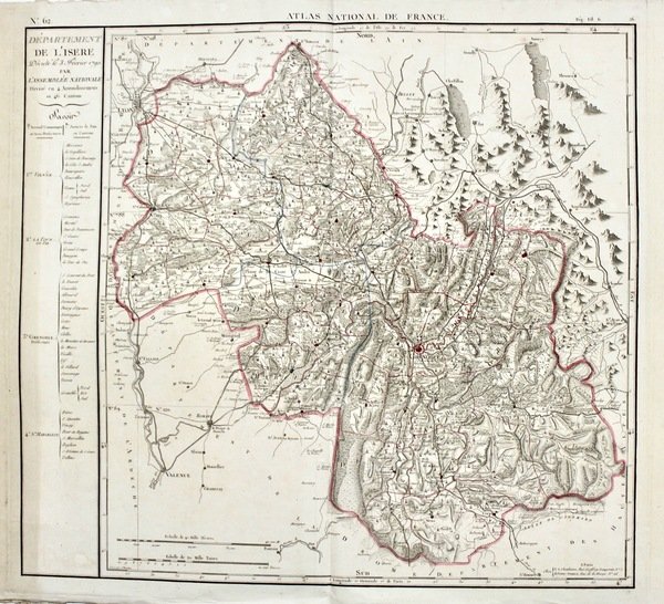 Incisione in rame di Houdon, mm 520x604, dipinta d'epoca ai confini, tratta da "Atlas National de France". Interessante e dettagliata carta colorata a mano lungo i confini. Raffigura Nîmes e la zona della Camargue. Ottime condizioni, con ampi margini; trascurabili fioriture marginali, un alone in basso.