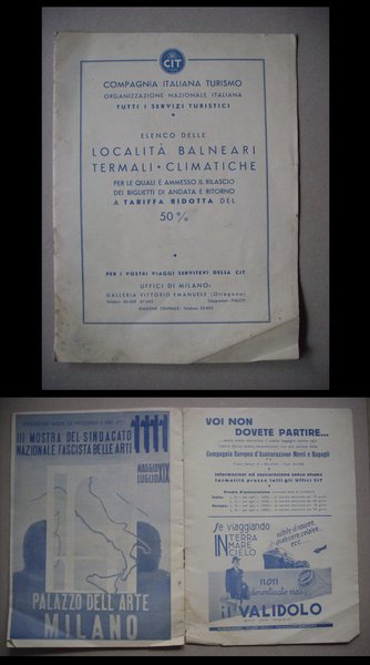 Depliant Compagnia Italiana Turismo CIT. Elenco località balneari termali / climatiche. All'interno tante belle pubblicità (pelikan / fert / III°Mostra del Sindacato Nazionale Fascista Belle Arti 1941)