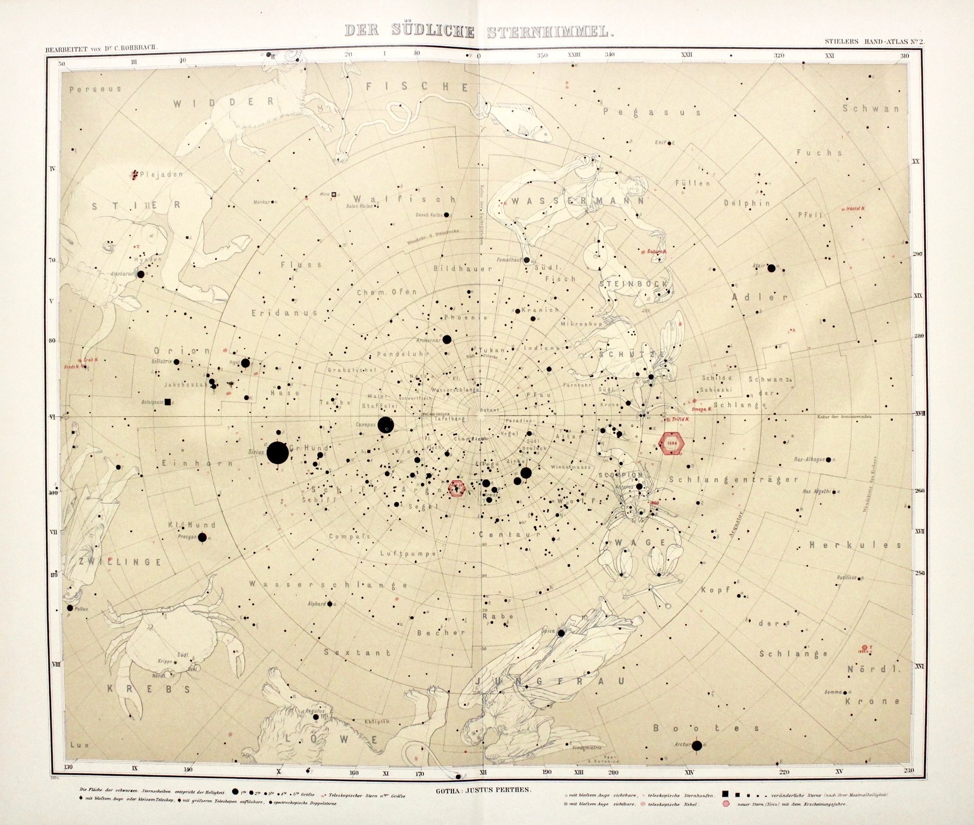 Coppia di incisioni, mm 340x410 ognuna, colore d’epoca a stampa. Tratta da Hand-Atlas. Bella coppia di carte celesti con le costellazioni evidenziate. Ottimo stao di conservazione.<BR>