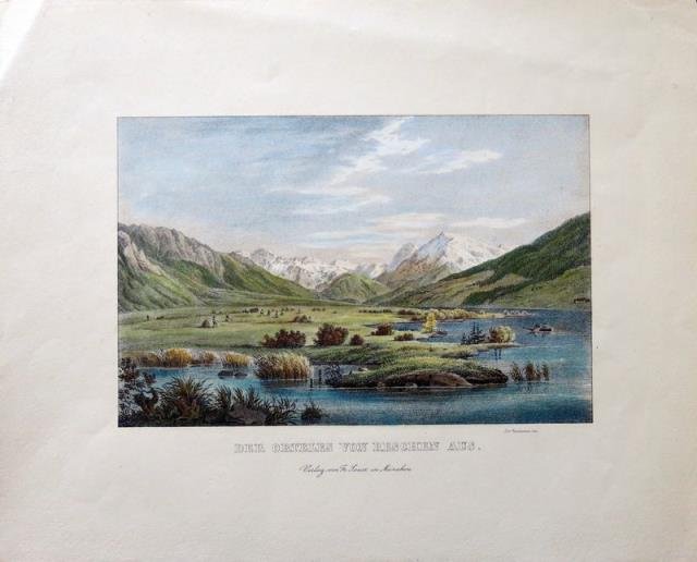 Fr. Sauer, Munchen, fine XIX secolo. Litografia in colore, cm 23 x 29 (il foglio). Piacevole vedutina del lago e del gruppo dell’Ortles con i suoi ghiacciai. Buono stato.