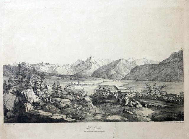 Munchen, Maler Haide, 1860 circa. Tono litografia con tenue presenza di bianco, cm 35 x 46,7 (il foglio). Veduta del gruppo alpino dell’Ortles con sassi malghe e baite in primo piano. Un marcato strappo nel margine inferiore interessa per pochi millimetri anche ilfigurato, normali difetti marginali, ben impressa, buono lo stato di conservazione.