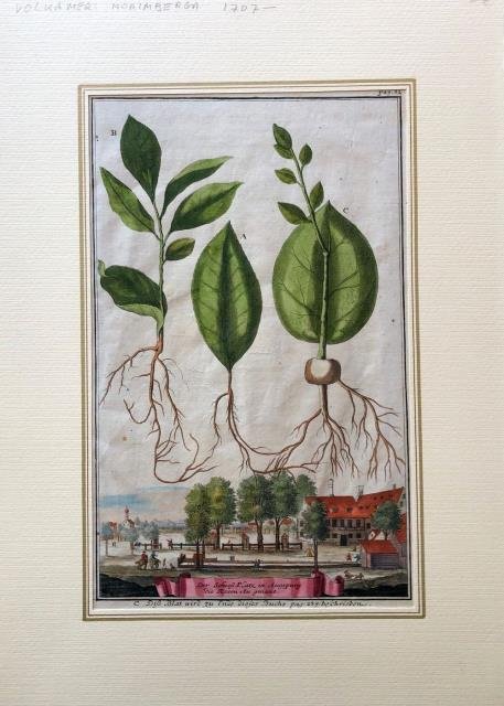 Tratta dall'opera di Johann Christoph Volkamer “Hesperides” (“Esperidi”) pubblicata a Norimberga intorno al 1710. Incisione in rame all'acquaforte, in recente ma in bella e vivace coloritura, cm 20,5 x 31 (alla lastra) più margini. Ottimo stato di conservazione. L'opera, in due volumi, consiste in una raccolta di tavole che raffigurano prevalentemente agrumi: limoni, lime, arance, bergamotti, pompelmi, ananas, melograni, ma anche noci di cocco, nelle loro varietà e forme, sia tipiche che esotiche, fluttuano come corpi celesti sopra le ville italiane, le campagne e i giardini, dando vita a un'opera originale e di gran fascino. L' apparato iconografico è di ricercata bellezza: le incisioni raffigurano frutti nella parte superiore; palazzi, ville, giardini e labirinti nella parte inferiore, con architetture che sono per lo più quelle del nord est d'Italia, ossia della provincia di Padova e di Verona. Johann Christoph Volkamer (1644 - 1720) figlio di un medico e botanico dedito alla progettazione di giardini, fu un intraprendente commerciante di Norimberga che ereditò dal padre la profonda passione per la botanica. Intorno al 1660 visitò numerosi parchi e giardini d' Italia, da cui nacque il suo particolare interesse per l’universo degli agrumi. Rientrato in Germania costruì il proprio giardino, dove instaurò numerose piante e da cui trasse ispirazione per realizzare i suoi numerosi schizzi, che sarebbero poi andati a comporre, fra il 1708 e il 1710, la sua opera più importante, il “Nürbergisches Hesperides oder gründliche Beschreibung der edlen Citronat, Citronen - und Pomeranzen – Früchte.”. In questa splendida raccolta (di evidente derivazione dalle “Hesperides, sive, De malorum aureorum cultura”, di Giovanni Battista Ferrari, opera che appunto celebrava gli agrumi) il Volckamer riuscì a coniugare suggestioni storiche e letterarie con una puntuale ricerca scientifica, intrecciando mirabilmente i frutti della natura a splendidi paesaggi e architetture. (Cfr. Blunt: “Delightful views of the gardens and palaces of Germany, Austria and Italy”). .