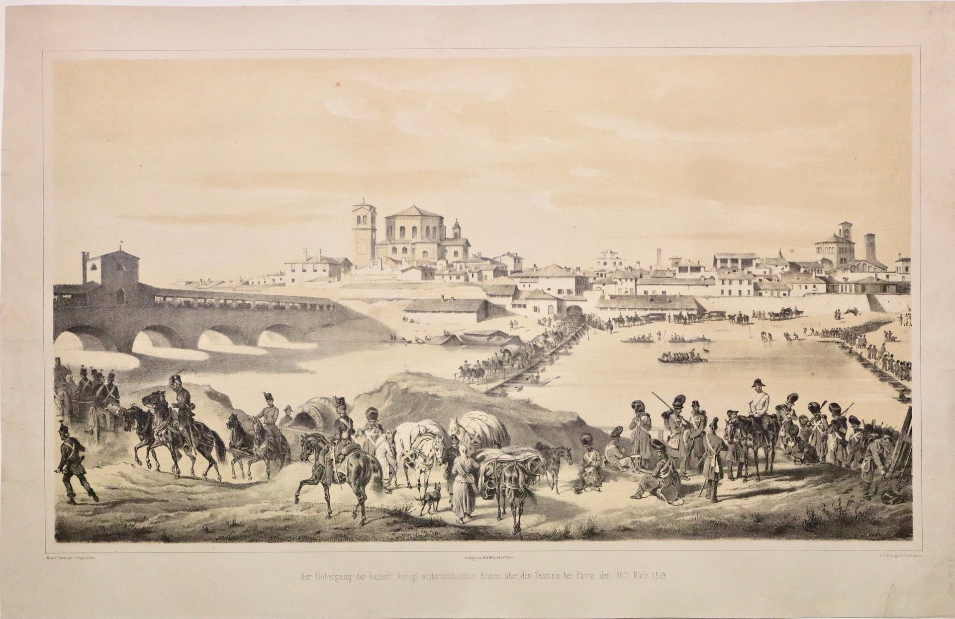 Litografia, mm 290x510. Grande veduta della città dalla sponda opposta del fiume mentre i soldati austriaci oltrepassano il Ticino. Buon esemplare con su carta arrossata con due strappi restaurati nel margine. Tratta dalla edizione pubblicata da Hölzel verso il 1880 della celeberrima opera “Erinnerung and die italienische Feldzuege der K.K. osterreich. Armee, 1848-49“ in cui vengono descritti, raffigurati e celebrati battaglie e momenti salienti della Prima guerra di Indipendenza vinta dagli austriaci.