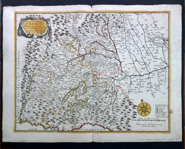 Chez F. Da Pointe, Paris, 1650 circa. Incisione in rame all’acquaforte, cm 39 x 50,5 (alla lastra) più margini, cartiglio e confini in colore d’epoca, in basso a destra una rosa dei venti, anch’essa colorata d’epoca, scala di miglia del Piemonte. Ottimo stato di conservazione. Carta molto rara dell’Italia nord - occidentale, centrata su Torino. La mappa si estende da Milano e Genova a est fino a Monaco e ai confini della Provenza e del Delfinato con la Francia. Jean Boisseau, fu un editore di mappe parigino, registrato come “maestro miniatore” nel 1631 e come “colorista di mappe” dal 1635. Pubblicò un certo numero di mappe dal 1635 - 1636. Tuttavia, Mirielle Pastoureau in “Les Atlas Francai” elenca soltanto una edizione dell’atlante “Theatre des Gaules”, di Boisseau, datata 1642. Si conosce anche una edizione successiva del 1648, da cui questa carta è probabilmente tratta, e tutte le sue carte sono estremamente rare. .