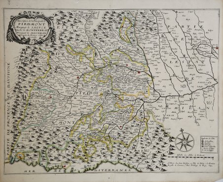 Mappa estremamente rara dell'Italia nord-occidentale, centrata su Torino. La mappa si estende da Milano e Genova a est fino a Monaco e ai confini della Provenza e del Delfinato con la Francia. Jean Boisseau, un editore di mappe parigino, è registrato come "maestro miniatore" nel 1631 e un "colorista di mappe" dal 1635 - "Enlumineur de cartes marines" / "Enlumineur du Roy pour les cartes geographiques". Boisseau pubblicò la sua prima mappa Diocesi d'Aire nel 1635, e un certo numero di mappe proprie dal 1636. Tuttavia, Mirielle Pastoureau in "Les Atlas Francais" elenca solo un'edizione dell'atlante Theatre des Gaules di Boisseau, datata 1642. Un'edizione successiva, del 1648, dell'atlante di Boisseau è anche conosciuta, ma tutte le sue carte sono estremamente rare. Acquaforte con bella colorazione originale dei contorni, in ottime condizioni. Extremely rare map of northwestern Italy, centered on Turin. The map extends from Milan and Genoa in the east to Monaco and the Provence and Dauphine borders with France. All of Boisseau's maps are rare. ' Jean Boisseau, a Parisian map publisher, is recorded as a 'master illuminator' in 1631 and a 'map colourist' from 1635 - "Enlumineur de cartes marines " / " Enlumineur du Roy pour les cartes geographiques ". Boisseau published his first map Diocese d'Aire in 1635, and a number of his own maps from 1636. However, Mirielle Pastoureau in "Les Atlas Francais" lists only one edition of Boisseau's atlas Theatre des Gaules, dated 1642. . . . A later 1648 edition of Boisseau's atlas has also been recorded. Copperplate with fine original colouring, great condition. Cfr.