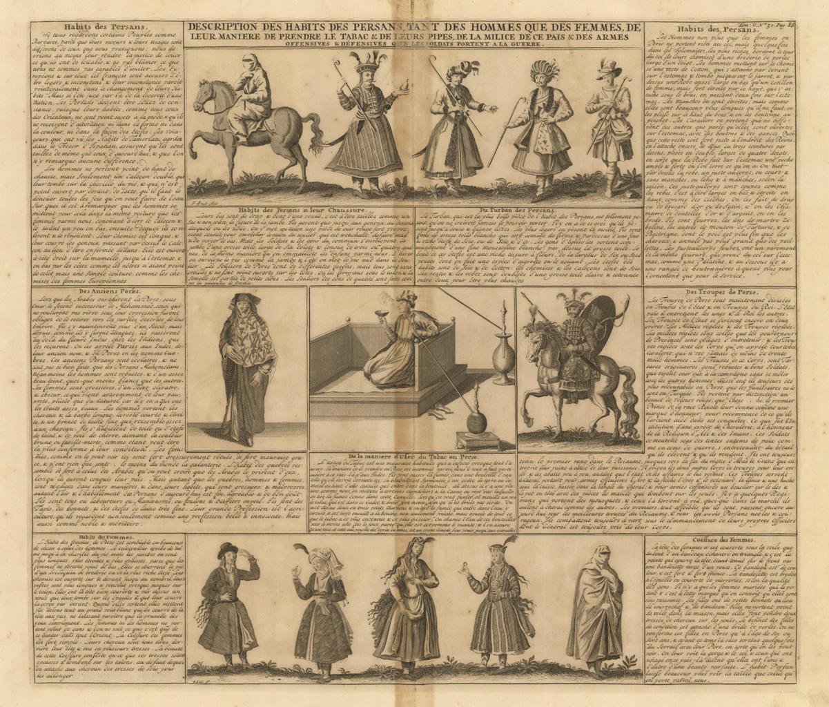 Description des Habits des Persans, tant des Hommes que des Femmes, de leur manière de prendre le tabac & de leurs pipes, de la milice de ce pais & des armes offensives & defensives que les soldats portent à la guerre