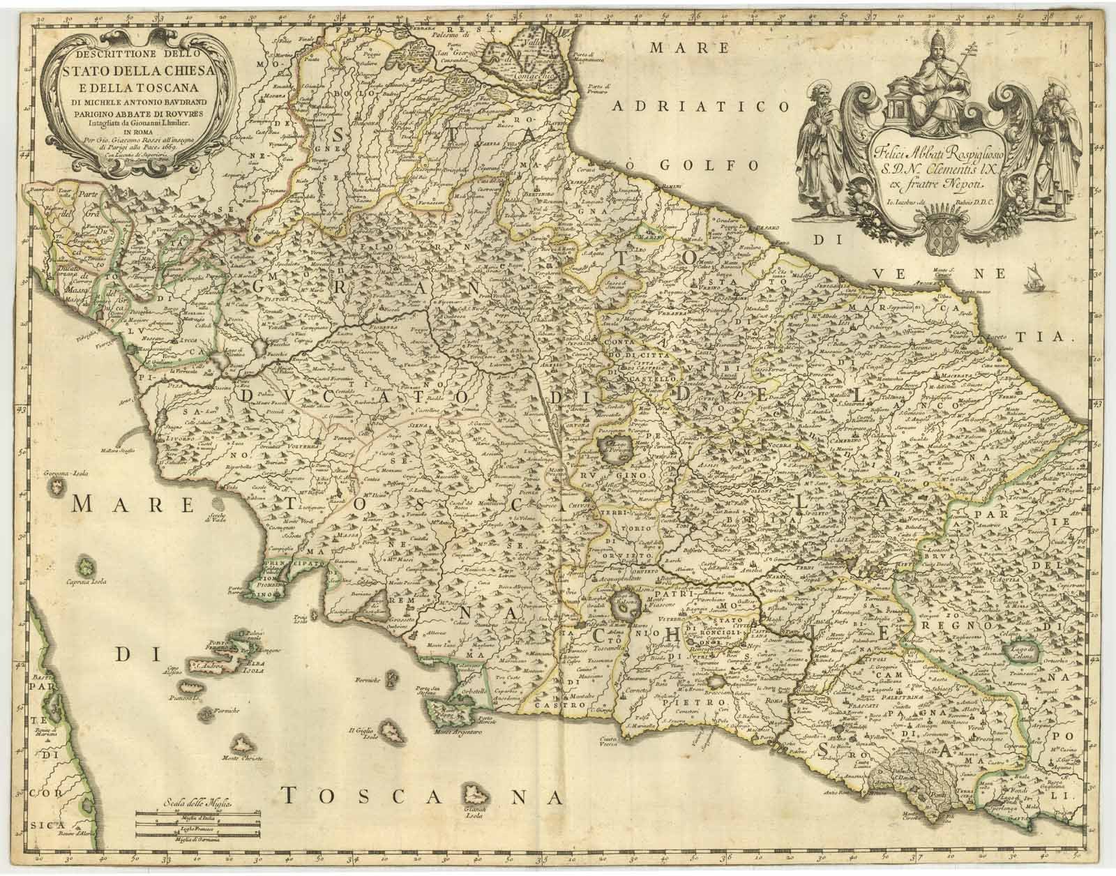 Carta della Toscana e dello Stato Pontificio con coloritura coeva ai confini. La carta inserita nell'opera "Mercurio geografico." edita da De Rossi verso la fine del '600 è stata disegnata da Michele Antonio Baudrand ed intagliata da Giovanni Lhuilier. La carta è ridimensionata al margine della scala graduata che è tutta visibile
