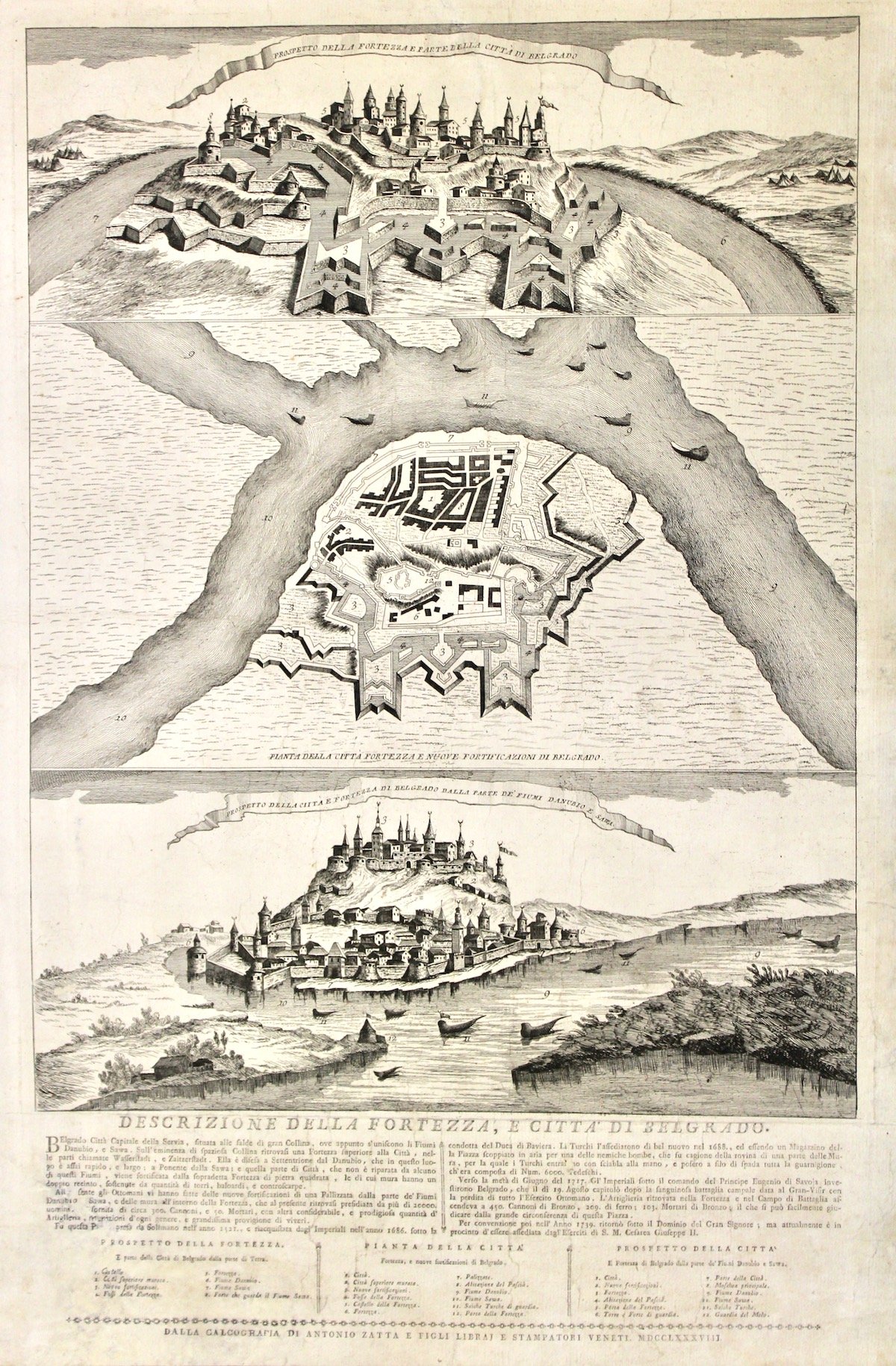 Incisione in rame su carta vergata, mm 540x410 (incisione) su foglio completo di testo di mm 680x460. (datata a penna 1788 con aggiunta di un anno).<BR>Assai rara pubblicazione d'occasione, stampata a causa di un rinnovato interesse per le sorti della città in Europa. Cita la didascalia alla fine di un breve riassunto della storia di Belgrado in basso "…Per convenzione poi nell'anno 1739, ritornò sotto il Dominio del Gran Signore; ma attualmente è in procinto di essere assediata dagl'eserciti di Sua Maestà Cesarea Giuseppe II ". La città venne infatti assediata nel 1789 dagli austriaci nell'ambito della guerra austro-ottomana del 1787. Nel 1791 al termine della guerra, tornò agli Ottomani. La stampa è divisa in tre parti : in alto una veduta prospettica dal titolo " Prospetto della fortezza e parte della città di Belgrado", in mezzo una pianta della stessa titolata " Pianta della città fortezza e nuove fortificazioni di Belgrado ", in basso una veduta della città nella parte difesa dai fiumi,difesa naturalmente chiamata " Prospetto della città e fortezza di Belgrado dalla parte de' fiumi Danubio e Sawa ". Ogni parte ha una sua legenda in basso di 8, 12 e 12 rimandi.<BR>Buon esemplare con discreti margini, qualche piega e piccolo restauro, particolarmente in basso nel testo, alcune lettere a sinistra non leggibili, altre leggermente ritoccate. <BR>Copper engraving, mm 540x410 (engraving) on a complete sheet with text of mm 680x460. Scarce publication printed just before the Austrian attack to Beograd in 1789. The print is divide in three parts called " Prospetto della fortezza e parte della città di Belgrado", " Pianta della città fortezza e nuove fortificazioni di Belgrado ", and " Prospetto della città e fortezza di Belgrado dalla parte de' fiumi Danubio e Sawa ". each part with a legend at bottom. Good example with minor restorations and damages, some letter in bottom left corner redrawn <BR><BR>
