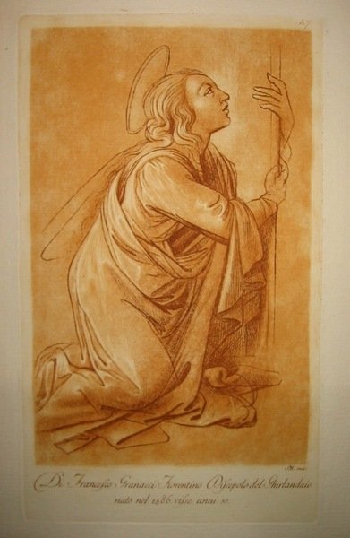 Acquatinta originale (cm. 18,5x31,5 più ampi margini bianchi) da un disegno conservato agli Uffizi di Firenze. Ottimo esemplare.