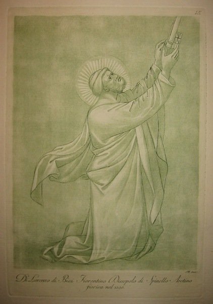 Acquatinta originale (cm. 22x32,5 più ampi margini bianchi) da un disegno conservato agli Uffizi di Firenze. Ottimo esemplare.