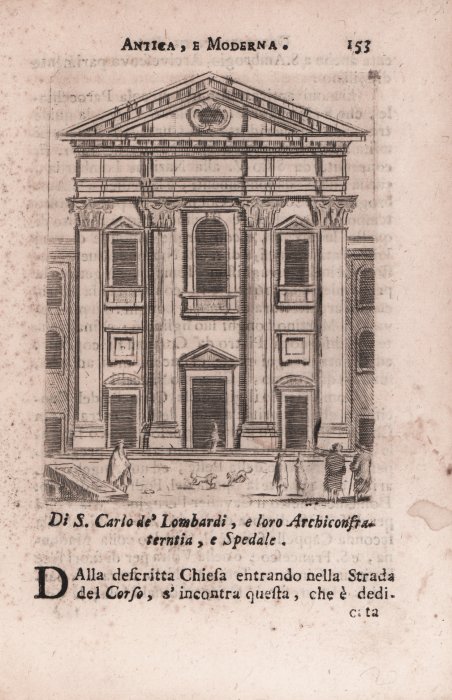 Veduta tratta da Roma antica e moderna o sia nuova descrizione di tutti gl'edifici antichi et moderni.della citta di roma stampato a Roma nel 1745 Apresso Gregorio Roisecco, Mercante di Libri in Piazza Navona. Questa guida di Roma fu pubblicata nel 1745 – con oltre duecento incisioni inserite nel testo e con tavole incise e piegate – ad istanza di Gregorio Roisecco, mercante di libri in piazza Navona. Con chirografo datato 18 maggio 1743 papa Benedetto XIV aveva tracciato i nuovi confini dei rioni di Roma, stabilendone anche i relativi nomi e i relativi stemmi, come risulta dalle circa duecento targhe stradali, in marmo bianco, apposte sui muri nel centro storico di Roma e che ancora oggi sono quasi tutte visibili. La guida di Gregorio Roisecco nasce quindi in un contesto di riorganizzazione urbanistica di tutta la città e per la prima volta ne suggerisce anche la visita per rioni, oltre a quella classica per giornate. Le descrizioni dei luoghi di Roma antica e di Roma moderna sono quindi fuse fra loro e presentano e illustrano tutte le meraviglie cittadine – sacre o profane – che si possono incontrare lungo i percorsi della visita. Acquaforte, in buono stato di conservazione. Cfr.