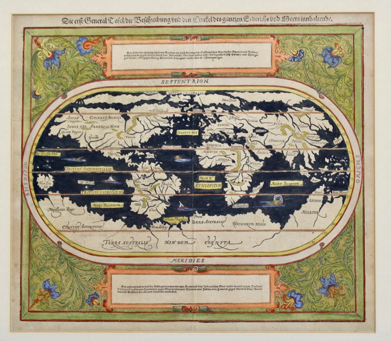 Silografia, mm 245x383. Testo tedesco in alto, nei riquadri ed al verso. Tratta da una edizione tedesca della “Cosmographia universalis”. Attraente esemplare del secondo planisfero utilizzato da Münster (a partire dal 1588), basato su quello di Ortelius. Nella parte inferiore si sviluppa la Terra incognita, un vasto continente che secondo antiche credenze doveva bilanciare le terre emerse dell’emisfero boreale. Il sud America è ritratto nella consueta forma di bulbo, così come da Ortelio nella prima versione del planisfero. A nord è evidenziato un ampio passaggio fra i ghiacci a nord del Canada. La carta in forma ovale è completamente circondata da un’ampia bordura a “ramages”. Ottimo esemplare con due piccolissimi fori di tarlo e lieve ingiallimento centrale della carta con margini più chiari.
