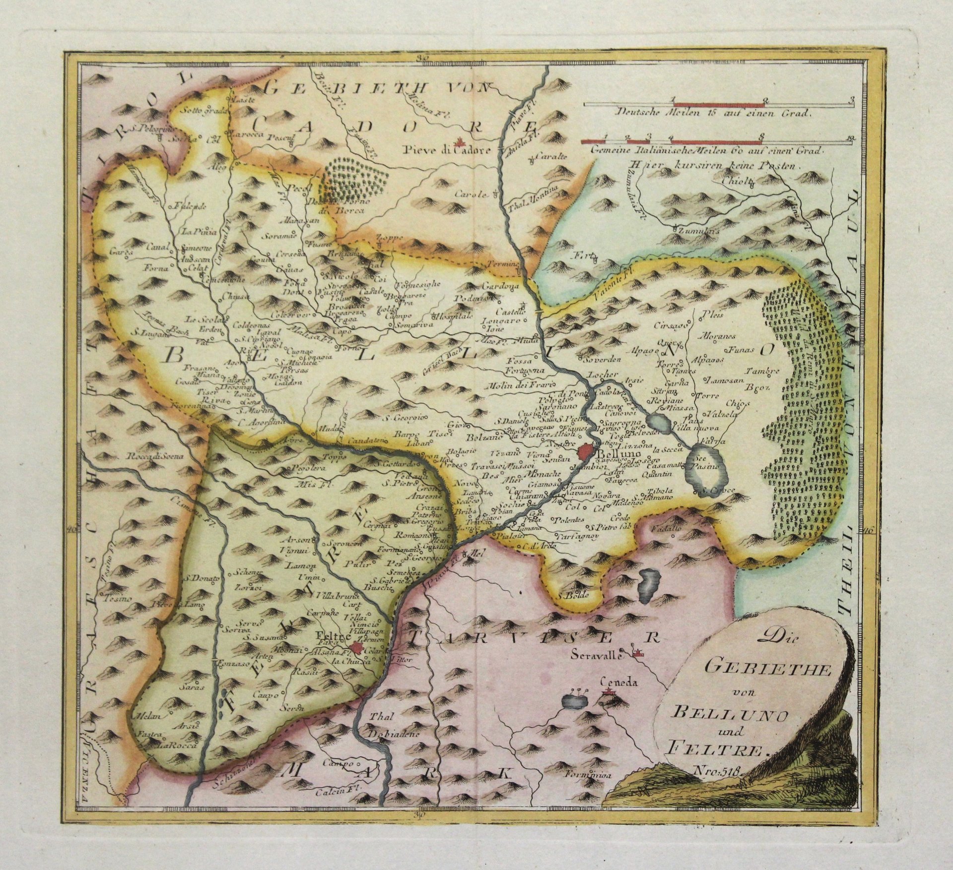 Incisione in rame, dipinta d’epoca e ritoccata a mano posteriormente, mm 220x270. Tratta dal conosciuto atlante “Schauplatz…der Welt” pubblicato da Reilly fra il 1789 e il 1806. Raffigura tutta la Romagna con un riquadro della zona a sud di Rimini. Perfetta.