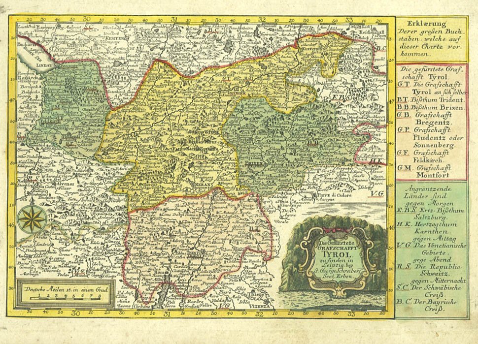 Incisione su rame di dimensioni 170x245 mm. Condizioni : USATO - Stato : Buono, ordinari segni d'uso e del tempo. Lievemente brunita. Altre note : Piccola carta raffigurante la contea del Tirolo, derivante da quella realizzata dal Seutter (1725-30). A colori, è inoltre corredata sulla destra di una legenda relativa alle suddivisioni politiche e amministrative. Scheda bibliografica tratta da "Il territorio trentino-tirolese nell'antica cartografia" di Gino Tomasi, scheda n. 60.