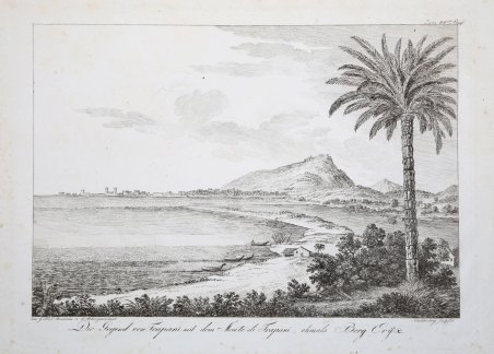 Incisione in rame su soggetto di Nicolovius, raffigurante Trapani da sud. ' Acquaforte, firmata in lastra in basso a destra, stampata su carta vergata coeva, con margini, in buono stato di conservazione. Copper engraving on a subject by Nicolovius, depicting Trapani from the south. ' Etching, signed in plate at lower right, printed on coeval laid paper, with margins, in good condition. Cfr.
