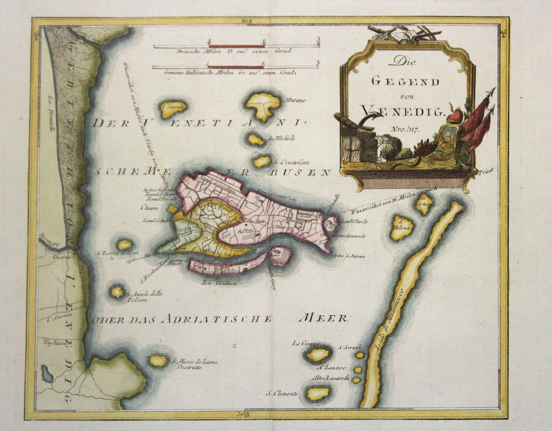 Incisione in rame, dipinta d’epoca e ritoccata a mano posteriormente, mm 230x270. Tratta dal conosciuto atlante “Schauplatz…der Welt” pubblicato da Reilly fra il 1789 e il 1806. Raffigura una pianta di Venezia con parte della laguna. Perfetta.