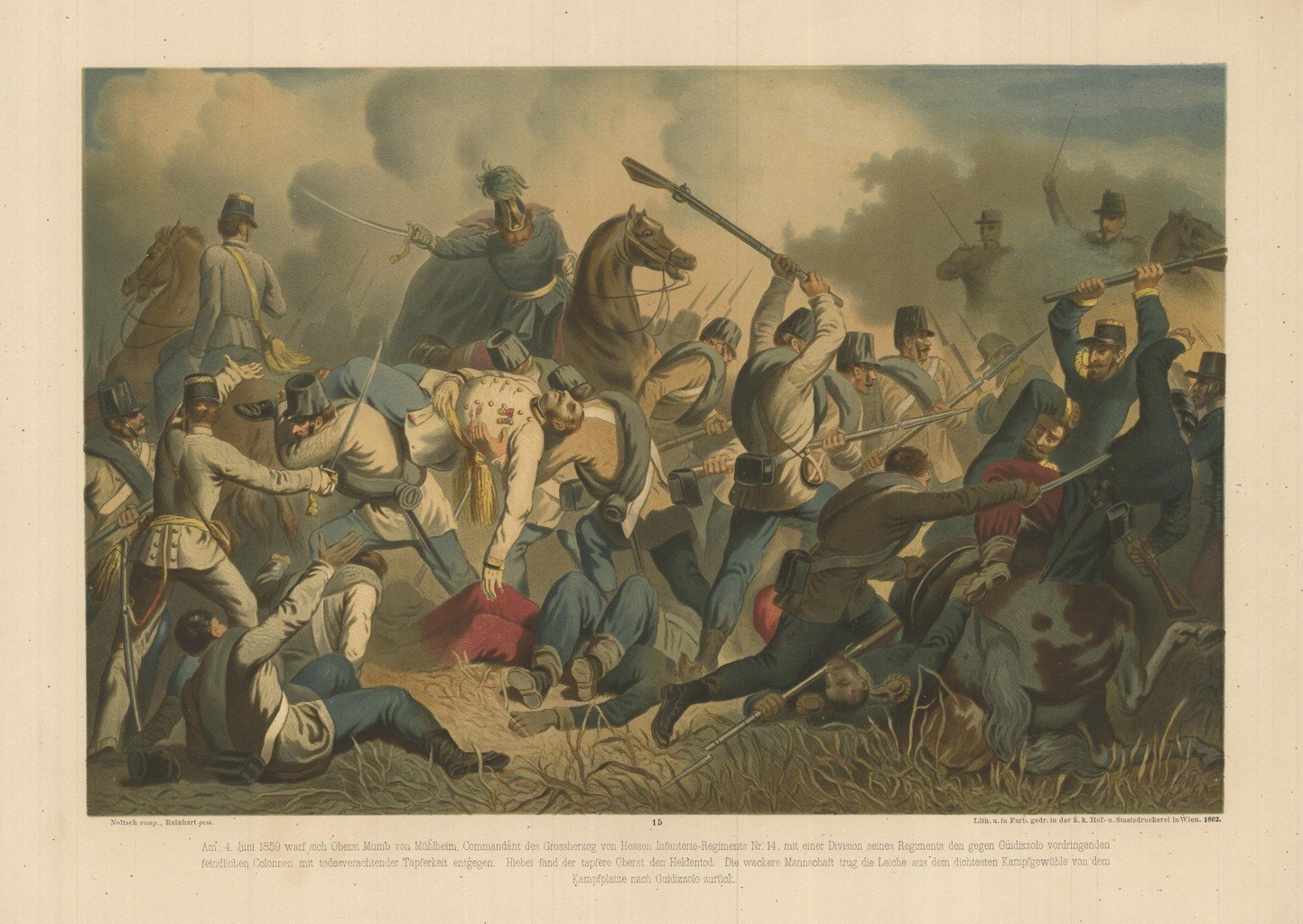 Stampa, antica ed originale, raffigurante una scena della battaglia di Solferino il 24 giugno 1859. Inserita nell'opera "Heldenzüge aus dem Jahre 1859" edita a Vienna nel 1862