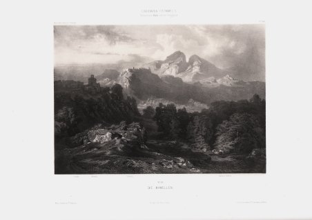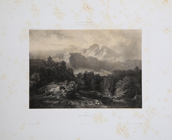 Veduta dell Monte Costasole, la cima più elevata dei Monti Ruffi meglio conosciuta popolarmente come "le Mammelle d'Italia". In primo piano Olevano, Civitella e Rocca S. Stefano. Tratta dalla celebre raccolta ' Skizzen und Bilder aus Rom ' [--Neapel; --Florenz] ' und Umgegend. [Stuttgart: Köhler, 1851-1860., una suite di tavole litografiche, molto rara, realizzata tra il 1851 e il 1860. Brunet cita solo la parte relativa a Roma e dintorni, mentre le altre due parti gli sfuggono. Le bellissime litografie, alcune delle quali firmate in pietra e datate 1848, raffigurano vedute di Roma (48 tavole, come la collazione di Brunet), di Napoli (36 vedute) e di Firenze (6 vedute). Karl August Lindemann-Frommel è stato un pittore di paesaggi e litografo. Lindemann nacque in Alsazia come quarto figlio della coppia di coniugi Karl August Philipp Lindemann (1776-1828) e Catharina Philippina Frommel (1787-1841). Il padre, proprietario di una fabbrica, morì quando Lindemann aveva nove anni. La custodia fu affidata allo zio Carl Ludwig Frommel, professore di pittura e incisione a Karlsruhe e direttore delle Pinacoteche granducali. Lindemann imparò il mestiere di artista da Frommel, che in seguito lo adottò. Il suo secondo insegnante influente fu Carl Rottmann. Dal 1844 al 1849 Lindemann viaggiò attraverso l'Italia, che sarebbe poi diventata il suo paese d'adozione. A Roma divenne membro fondatore dell'Associazione degli artisti tedeschi nel 1845. Incontra Karl Christian Andreae, di quattro anni più giovane, e lo ispira a studiare i paesaggi italiani. In seguito ha vissuto a Monaco e a Parigi, dove ha approfondito la pittura a olio. Nel 1856 Karl Lindemann-Frommel si stabilì a Roma, dove fu nominato professore all'Accademia di San Luca. Visse e lavorò a Roma fino alla sua morte, avvenuta nel 1891. Il Meyers ' Konversations-Lexikon, 1908, descrive le sue opere grafiche: "Come frutto dei suoi studi [in Italia] pubblicò una serie di vedute di Roma, Napoli, Firenze ecc. in litografie parzialmente colorate (Lipsia, 1851), a cui seguirono nel 1858 fogli litografati con motivi delle Paludi Pontine e 24 fogli di vedute di Potsdam”. Litografia tinta, buono stato di conservazione. Bibliografia Brunet III, 1082; Lindemann-Frommel, Karl, in Hans Vollmer, ' Allgemeines Lexikon der Bildenden Künstler von der Antike bis zur Gegenwart. Begründet von Ulrich Thieme und Felix Becker. Band 23: Leitenstorfer–Mander. E. A. Seemann, Leipzig 1929, p. 240; Peter K. W. Freude: ' Karl Lindemann-Frommel. Ein Malerleben in Rom. 1997. View of Mount Costasole, the highest peak of the Ruffi Mountains better known popularly as "the Mammelles of Italy." Olevano, Civitella and Rocca S. Stefano in the foreground. Taken from the famous collection ' Skizzen und Bilder aus Rom [--Neapel; --Florenz] und Umgegend. ' [Stuttgart: Köhler, 1851-1860., a very rare suite of lithographic plates made between 1851 and 1860. Brunet mentions only the part relating to Rome and its surroundings, while the other two parts escape him. The beautiful lithographs, some of them signed in stone and dated 1848, depict views of Rome (48 plates, like Brunet's collation), Naples (36 views) and Florence (6 views). Karl August Lindemann-Frommel was a landscape painter and lithographer. Lindemann was born in Alsace as the fourth child of the married couple Karl August Philipp Lindemann (1776-1828) and Catharina Philippina Frommel (1787-1841). His father, a factory owner, died when Lindemann was nine years old. Custody was entrusted to his uncle Carl Ludwig Frommel, a professor of painting and printmaking in Karlsruhe and director of the Grand Ducal Picture Galleries. Lindemann learned the artist's trade from Frommel, who later adopted him. His second influential teacher was Carl Rottmann. From 1844 to 1849 Lindemann traveled through Italy, which would later become his adopted country. In Rome he became a founding member of the Association of German Artists in 1845. He met Karl Christian Andreae, four years his junior, and inspired him to study Italian landscapes. He later lived in Munich and Paris, where he delved into oil painting. In 1856 Karl Lindemann-Frommel settled in Rome, where he was appointed professor at the Accademia di San Luca. He lived and worked in Rome until his death in 1891. The Meyers Konversations-Lexikon, 1908, describes his graphic works: "As the fruit of his studies he published a series of views of Rome, Naples, Florence etc. in partially colored lithographs (Leipzig, 1851), which was followed in 1858 by lithographed sheets with motifs of the Pontine Marshes and 24 sheets of views of Potsdam." Tinted lithograph, good condition. Bibliografia Brunet III, 1082; Lindemann-Frommel, Karl, in Hans Vollmer, ' Allgemeines Lexikon der Bildenden Künstler von der Antike bis zur Gegenwart. Begründet von Ulrich Thieme und Felix Becker. Band 23: Leitenstorfer–Mander. E. A. Seemann, Leipzig 1929, p. 240; Peter K. W. Freude: ' Karl Lindemann-Frommel. Ein Malerleben in Rom. 1997. Cfr.