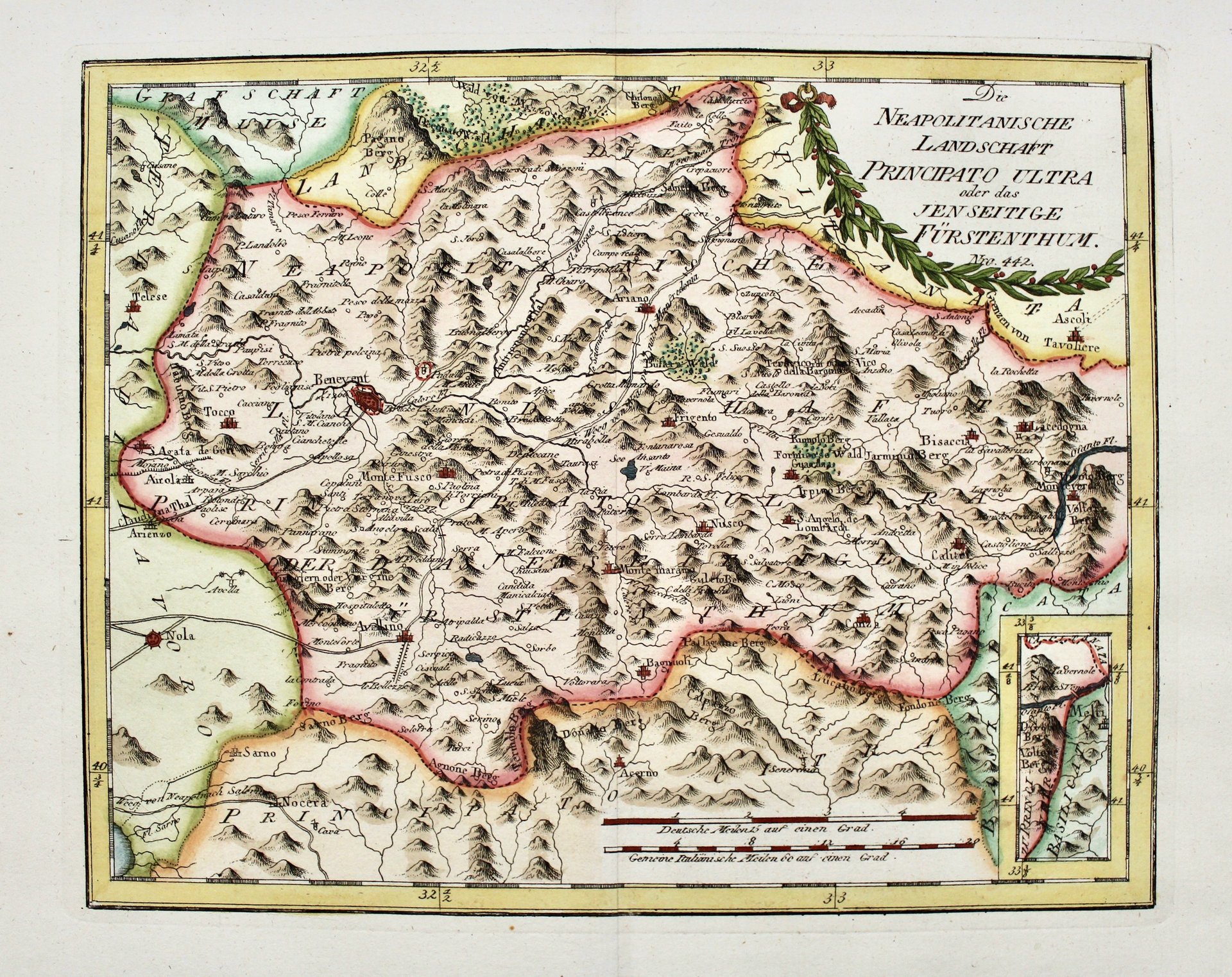 Incisione in rame, dipinta d'epoca e rifinita a mano posteriormente, mm 240x300. Tratta dal conosciuto atlante "Schauplatz…der Welt" pubblicato da Reilly fra il 1789 e il 1806. Raffigura tutta la provincia di Benevento. Perfetta. <BR>