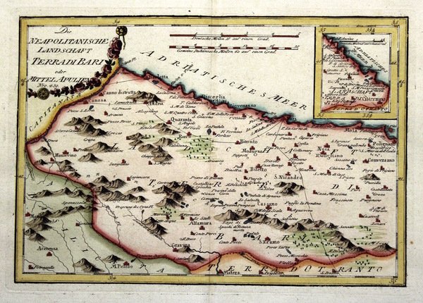 Incisione in rame, dipinta d'epoca e rifinita a mano posteriormente, mm 220x315. Tratta dal conosciuto atlante "Schauplatz…der Welt" pubblicato da Reilly fra il 1789 e il 1806. Raffigura il territorio fra l'Ofanto-Polignano-Castellaneta-Matera-Acerenza. Perfetta. <BR>