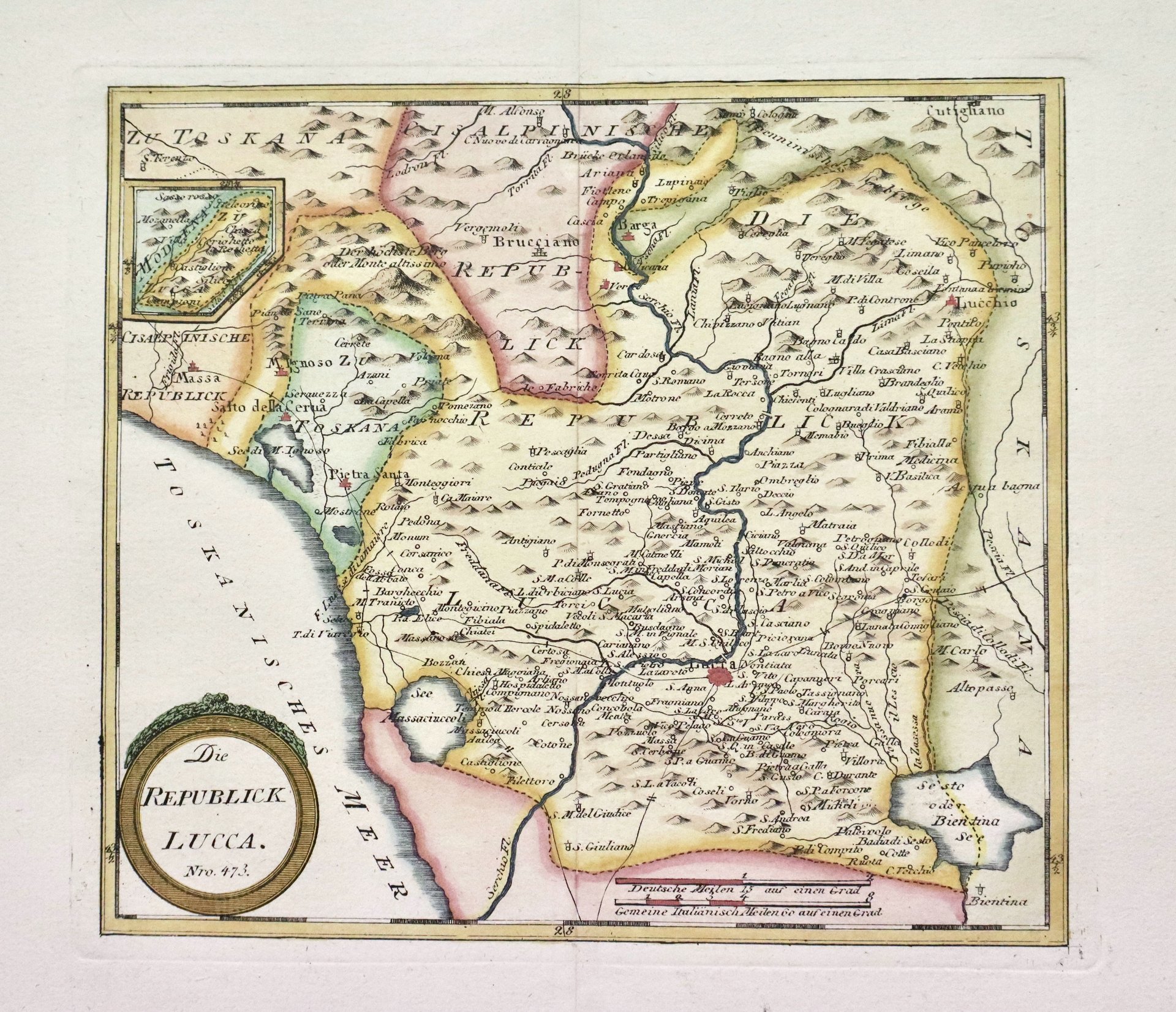 Incisione in rame su carta forte colorata in parte d'epoca editorialmente e rifinita posteriormente, mm 204x228. Raffigura il territorio fra Massa e il lago di Bientina. Ottimo esemplare. Copperplate engraving on strong paper, original colour with refreshes, mm 204x228. Mint condition.