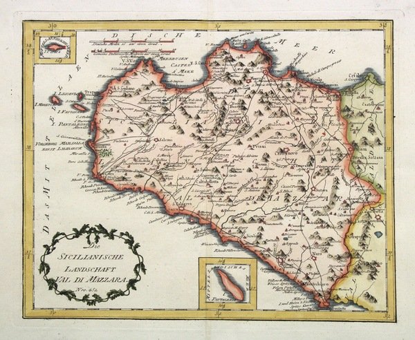 Incisione in rame, dipinta d'epoca e rifinita a mano posteriormente, mm 260x320. Tratta dal conosciuto atlante "Schauplatz…der Welt" pubblicato da Reilly fra il 1789 e il 1806. Raffigura la Sicilia occidentale da Licata fino a Trapani e Cefalù sulla costa nord. Perfetta. <BR>