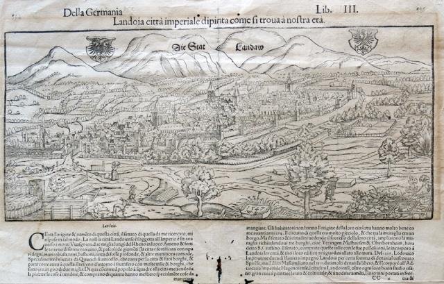 Dalla “Cosmographiae Universalis”, Basilea, 1550 circa. Xilografia, b/n, cm 30 x 40 (il foglio). Sebastian Munster (1488 – 1552). Al margine inferiore del foglio la descrizione della città che continua al retro del foglio (dove è presente il nome della stessa città di Landoia a grandi caratteri e seguita da una breve anteprima della descrizione stessa, e dove sono presenti due incisioni in piccolo riquadro). Lavori di tarlo nella parte inferiore del foglio e ingiallimento marginale, la veduta del città si presenta in buono stato. .