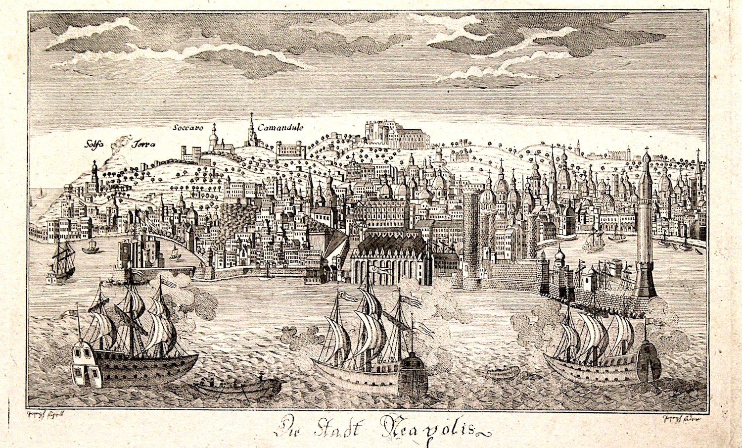 Incisione in rame, 190x300. Rara incisione che ripropone la bella veduta generale della città vista dal mare di Werner in una versione semplificato sotto il profilo incisorio. La stampa è firmata ma le firme non risultano leggibili, come riporta anche la bibliografia "La città di Napoli fra vedutismo e cartografia" di Pane-Valerio a pag. 216. Ottimo esemplare, margine un pò corto in testa, rifilato alla battuta del rame.