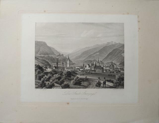 Innsbruck, F. Unterberger, 1840 circa. Incisione in rame all'acquatinta, b/n, cm 21 x 27,5 circa (alla lastra) più margini. Questa acquatinta rappresenta una variante di edizione, è originale e identica agli esemplari tradizionali di questa raccolta, ma è stampata su carta applicata al suo cartoncino. Veduta disegnata dallo Schweighofer e incisa da Frédéric Martens (1809 – 1875). Rara veduta della città di Vipiteno, una delle più rinomate località altoatesine, questa veduta raffigura la strada che vi conduce, la località a valle, e lo scorcio dei suoi monti. Il raffinato uso della tecnica dell’acquatinta permette una meticolosa distribuzione della polvere di bitume sulla lastra (passaggio cruciale in questa tecnica) la quale si risolve in tonalità morbide e tenui che conferiscono volume alla veduta. Uniforme ingiallimento del cartoncino, ottima impressione dell'inciso, buona conservazione.