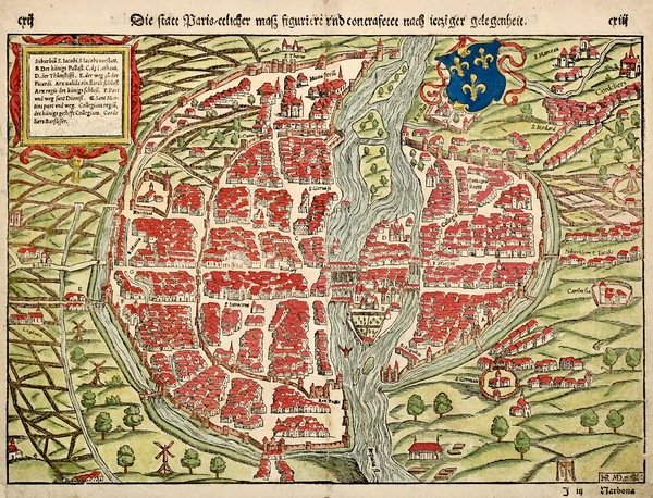 Incisione in legno, mm 250x355 (l'immagine), colorata a mano, raffigurante una fascinosa pianta della capitale francese, ritratta con gusto per la miniatura. In alto lo stemma con i gigli di Francia. L'incisione è tratta da "Cosmographia universalis", una delle prime descrizioni del mondo intero e la più importante opera geografica tedesca dopo la Cronaca di Norimberga del 1493. Bell'esemplare con rinforzi alla parte inferiore della piega centrale e di alcune parti dell'estremità dei margini.