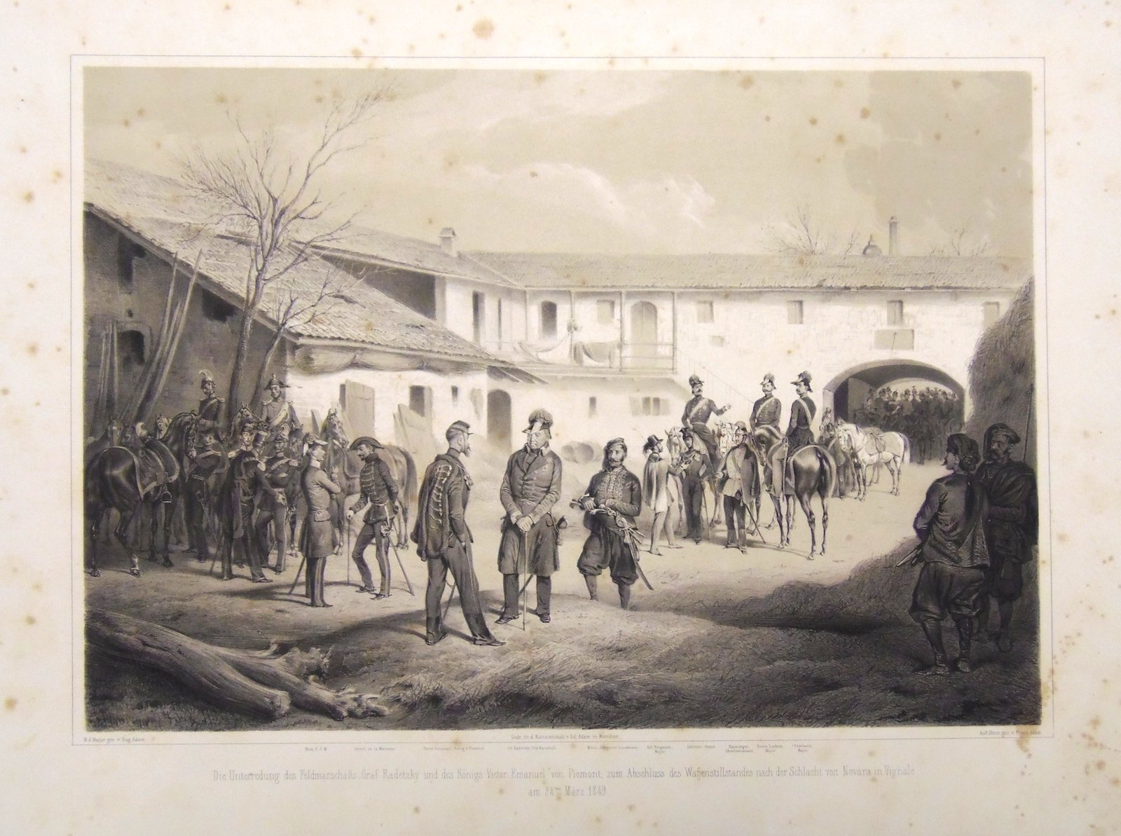 Litografia, 330x435. Descrive l'incontro fra Vittorio Emanuele e Radezky a Vignale. Tratta da "Erinnerung and die italienische Feldzuege der K.K. osterreich. Armee, 1848-49". Bell'esemplare con qualche fioritura.