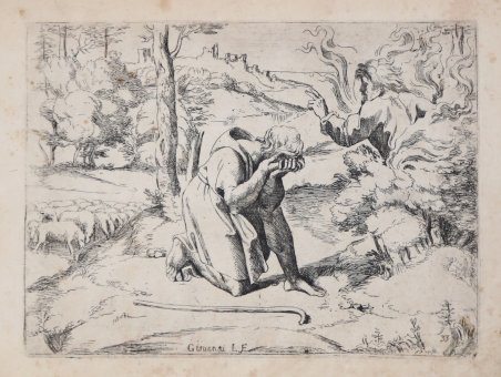 Acquaforte, circa 1607, firmata in lastra. Bellissima prova, con pieni margini, alcuni strappi nei margini bianchi dove sono presenti delle leggere gore d’acqua che non intaccano la parte incisa, per il resto in buono stato di conservazione. La tavola appartiene alla famosa Bibbia di Raffaello, incisa da Sisto Badalocchio e Giovanni Lanfranco, dal titolo Historia del Testamento Vecchio dipinta in Roma nel Vaticano da Raffaello da Urbino et intagliata in rame da Sisto Badalocchi et Giovanni Lanfranchi Parmigian. Al Sig. Annibale Carracci. In Roma appresso a Giovanni Orlandi. Con licenza de' Superiori. 1607. La serie fu realizzata intorno al 1607 a Roma, dove i due artisti erano allievi di Annibale Carracci; 28 delle tavole sono incise da Lanfranco, 23 da Badalocchio. Le opere derivano dagli affreschi di Raffaello nella loggia del Vaticano. Scrive Michael Bury in The Print in Italy, BM 2001, cat.90: “The etchings reverse Raphael's compositions. Mussini noted a tendency to simplification and alteration, especially in Badalocchio (Mussini, 1979, p.61); Borea suggested that the prints are the result of some critical reflection (1986, p.xvi). In the plate shown here, the spatial structure is substantially altered by cutting the height of the scene, making Isaac's head almost touch the top edge. This is in line with what is done in many others, by Sisto Badalocchio as well as Lanfranco. The effect is to increase the size and impact of the figures, for it is their movements and their relationships with one another that are at the centre of attention. The long dedication to Annibale Carracci reveals that the drawings had been made during the previous summer, while the Pope was away from the Vatican. Annibale's illness had prevented Badalocchio and Lanfranco from studying with him, and, keen to pursue their studies during this period, they had turned to the work of Raphael, whom Annibale always praised so much. They had now decided to publish their drawings for the benefit of young students of painting who live far away, executing them in etching 'for greater speed' ("per maggiore prestezza"). It is pointed out that not everyone has appreciated the Loggie frescoes as much as they deserve, believing them to have only been designed by Raphael; however for the variety of the inventions and for their sublime subjects they are worthy of the highest regard. Ginzburg Carignani (1996, p.130 and n.112) has shown that the preface was not in fact written by the two pupils, but by G.B.Agucchi (1570-1632) the patron and writer on art. Agucchi was a great champion of the Carracci and of Annibale in particular, seeing them as the reformers who had restored painting to the true path marked out first by the ancients and then, in modern times, by Raphael”. Plate of the Raphael Bible etched by Badalocchio and Lanfranco, titled Historia del Testamento Vecchio dipinta in Roma nel Vaticano da Raffaello da Urbino et intagliata in rame da Sisto Badalocchi et Giovanni Lanfranchi Parmigian. Al Sig. Annibale Carracci. In Roma appresso a Giovanni Orlandi. Con licenza de' Superiori. 1607. The series consists of 54 plates, a frontispiece and three etched plates with dedicatory text to Annibale Carracci and 50 plates after Raphael that are numbered from 5 to 54. The set was made when the two etchers were both young pupils of Carracci in Rome in 1607 and were said to have been made to try to lift him out of depression; 28 plates are by Lanfranco (Bartsch XVIII.345.1 to 28) and 23 (including the frontispiece) by Badalocchio (Bartsch XVIII.354.1 to 23). From Michael Bury, The Print in Italy, BM 2001, cat.90: “The etchings reverse Raphael's compositions. Mussini noted a tendency to simplification and alteration, especially in Badalocchio (Mussini, 1979, p.61); Borea suggested that the prints are the result of some critical reflection (1986, p.xvi). In the plate shown here, the spatial structure is substantially altered by cutting the height of the scene, making Isaac's head almost touch the top edge. This is in line with what is done in many others, by Sisto Badalocchio as well as Lanfranco. The effect is to increase the size and impact of the figures, for it is their movements and their relationships with one another that are at the centre of attention. The long dedication to Annibale Carracci reveals that the drawings had been made during the previous summer, while the Pope was away from the Vatican. Annibale's illness had prevented Badalocchio and Lanfranco from studying with him, and, keen to pursue their studies during this period, they had turned to the work of Raphael, whom Annibale always praised so much. They had now decided to publish their drawings for the benefit of young students of painting who live far away, executing them in etching 'for greater speed' ("per maggiore prestezza"). It is pointed out that not everyone has appreciated the Loggie frescoes as much as they deserve, believing them to have only been designed by Raphael; however for the variety of the inventions and for their sublime subjects they are worthy of the highest regard. Ginzburg Carignani (1996, p.130 and n.112) has shown that the preface was not in fact written by the two pupils, but by G.B.Agucchi (1570-1632) the patron and writer on art. Agucchi was a great champion of the Carracci and of Annibale in particular, seeing them as the reformers who had restored painting to the true path marked out first by the ancients and then, in modern times, by Raphael. Etching, printed on contemporary laid paper, with full margins showing tears at waterstains, otherwise good condition. Cfr. TIB.40.17