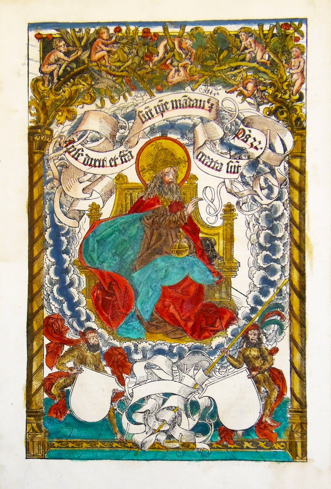 Woodcut, mm 380x240 (sheet 470x320), original colour, verso with german text and a manuscript capital initial coloured with grey colour, text with red underlinings and rubrications. A fine example with light marginal water stain and minor defects in margins<BR>From the rare german edition of "Liber Chronicarum", a milestone of illustrated travel-books and one of the most famous books of the 15th century. The engravings are all by Michael Wohlgemuth, teacher of Albrecht Duerer., his stepson Wilhelm Pleydenwurff and some are attributed to the young Duerer.<BR>The views from "Liber Chronicarum" or "Nuremberg Chronicle" as it is commonly referred to, are among the earliest realistic obtainable views in the market. This impressive woodcut depicts God the Father seated on a throne surrounded by the firmament. Cherubs cavort in the heavens above and two devilish creatures holding armorial crests are at bottom. A banner reads "God said Let there be and all things were made".<BR>Silografia. mm 380x240 (foglio 470x320). Coloritura originale, verso con testo tedesco con una iniziale miniata in grigio con decori policromi, rubricature e sottolineature in rosso. Tratta dalla più rara edizione tedesca del "Liber Chronicarum" comunemente chiamato appunto "Cronaca di Norimberga": fu la prima opera con raffigurazioni reali delle città del mondo ed ebbe un enorme successo, tale da essere considerata una pietra miliare nello sviluppo della conoscenza geografica. Fu stampato in due edizioni, la prima latina nel luglio 1493 in circa 1500 copie, la seconda, tedesca, in dicembre dello stesso anno, in circa 800 esemplari. Le incisioni sono opera di Michael Wohlgemuth, maestro di Albrecht Duerer, del figliastro Wilhelm Pleydenwurff e del giovane Duerer stesso.<BR>Bell'esemplare con minimi aloni e piccoli difetti al margine