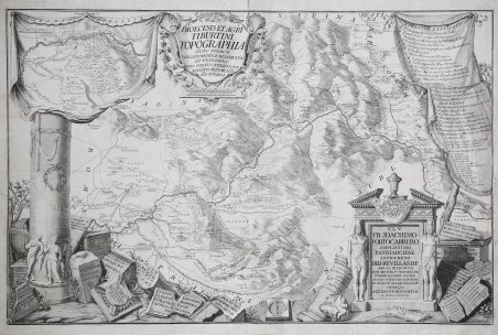 Grande carta della Valle dell'Aniene (l'antica Diocesi Tiburtina) incisa da Giovanni Petroschi e disegnata da Diego de Revillas.Nel cartiglio in alto, il titolo “Dioecesis et agri Tiburtini topographia nunc primum trigonometrice delineata et veteribus viis villis ceterisque antiquis monumentis adornata”. In basso a destra, il nome dell’incisore, Giovanni Petroschi: “Io. Petroschi inc”. Sul monumento in basso a destra, la dedica dell’autore, Diego de Revillas, al patriarca di Antiochia Joachim Portocarrero, e la data, 1739.La carta costituisce, con quella della Diocesi dei Marsi pubblicata sempre dal Revillas nel 1735, uno dei primi tentativi di applicare le misurazioni trigonometriche per costruire una carta geografica “nunc primum trigonometrice delineata”, per dirla con l’autore. È noto che Revillas fece più di 150 misure angolari.L’orografia, l’idrografia e la topografia sono molto accurate. La presentazione artistica della carta è tipica dell’epoca. In alto a sinistra, drappeggio con cartina dei “Tiburis suburbia” con scala grafica propria; a destra, lungo drappeggio per la “notarum explicatio” delle sigle e dei segni convenzionali inserite nel testo.La carta ebbe un’edizione postuma nel 1767 per opera del Petroschi che la dedicò al card. Flavio Chigi.Acquaforte, impressa su carta vergata coeva, con margini, tracce di colla al verso, in ottimo stato di conservazione.Bibliografia: A. P. Frutaz, Le carte del Lazio, I, XXXVII, 1, Roma 1972, pp. 82-83; G. Lugli, Monumenti antichi dei Lincei, XXXI (1926), 468, n. 3; L. Luzio, Diego de Revillas e le sue carte della diocesi marsicana e tiburtina, in Rivista Geographica Italiana, 56, pp. 331-41; T. Ashby, The Classical topography of the Campagna Romana, in Papers of the British School at Rome, 3 (1906), pp. 198-200 Grande carta della Valle dell'Aniene (l'antica Diocesi Tiburtina) incisa da Giovanni Petroschi e disegnata da Diego de Revillas.Nel cartiglio in alto, il titolo “Dioecesis et agri Tiburtini topographia nunc primum trigonometrice delineata et veteribus viis villis ceterisque antiquis monumentis adornata”. In basso a destra, il nome dell’incisore, Giovanni Petroschi: “Io. Petroschi inc”. Sul monumento in basso a destra, la dedica dell’autore, Diego de Revillas, al patriarca di Antiochia Joachim Portocarrero, e la data, 1739.La carta costituisce, con quella della Diocesi dei Marsi pubblicata sempre dal Revillas nel 1735, uno dei primi tentativi di applicare le misurazioni trigonometriche per costruire una carta geografica “nunc primum trigonometrice delineata”, per dirla con l’autore. È noto che Revillas fece più di 150 misure angolari.L’orografia, l’idrografia e la topografia sono molto accurate. La presentazione artistica della carta è tipica dell’epoca. In alto a sinistra, drappeggio con cartina dei “Tiburis suburbia” con scala grafica propria; a destra, lungo drappeggio per la “notarum explicatio” delle sigle e dei segni convenzionali inserite nel testo.La carta ebbe un’edizione postuma nel 1767 per opera del Petroschi che la dedicò al card. Flavio Chigi.Acquaforte, impressa su carta vergata coeva, con margini, tracce di colla al verso, in ottimo stato di conservazione.Bibliografia: A. P. Frutaz, Le carte del Lazio, I, XXXVII, 1, Roma 1972, pp. 82-83; G. Lugli, Monumenti antichi dei Lincei, XXXI (1926), 468, n. 3; L. Luzio, Diego de Revillas e le sue carte della diocesi marsicana e tiburtina, in Rivista Geographica Italiana, 56, pp. 331-41; T. Ashby, The Classical topography of the Campagna Romana, in Papers of the British School at Rome, 3 (1906), pp. 198-200 Cfr.