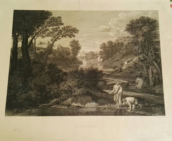 Bella incisione mitologica. Stampata da Alfred Chardon jeune, Paris. Incisa da Grèbert, da un disegno di Poussin. Diogene di Sinope (Sinope, 412 a.C. circa – Corinto, 10 giugno 323 a.C.), è stato un filosofo greco antico. Considerato uno dei fondatori della scuola cinica insieme al suo maestro Antistene, secondo l'antico storico Diogene Laerzio, morì nel medesimo giorno nel quale Alessandro Magno spirò a Babilonia. Leggeri strappi nella parte superiore centrale. In generale buono stato di conservazione. Dimensioni: 58 cm x 49.
