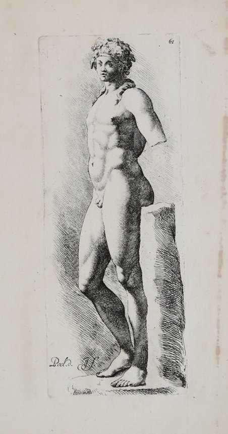 Acquaforte, 1670 circa, firmata in lastra con il monogramma. Una bella impressione, stampata su carta vergata coeva, con margini, ottime condizioni. La tavola è tratta da Signorum veterum icones, una collezione di sculture e statue romane di Jan de Bisschop (Johannes Episcopius) pubblicata per la prima volta nel 1668. Questa suite di 100 stampe di de Bisschop comprende sculture classiche conservate in collezioni olandesi e italiane nel XVII secolo. Le statue antiche erano molto apprezzate come opere d’arte, in particolare dagli artisti che ne ammiravano la loro rappresentazione di anatomia, drappeggi e pose. Questa suite comprende alcune delle sculture più importanti, da vari punti di vista, alle quali l’artista ebbe accesso. Alcune delle sculture classiche riprodotte nel Signorum veterum icones provengono dalle collezioni seicentesche di Gerrit Uylenburgh e Hendrik Scholten, alle quali de Bisschop aveva accesso diretto. La sequenza dell’opera è rigorosamente conforme alla tradizione classica: le prime illustrazioni riguardano le parti del corpo (questa sezione è stata lasciata incompiuta alla morte prematura di de Bisschop): statue complete, seguite da pose e suggerimenti per composizioni con più di una figura. Le stampe avevano lo scopo di fornire agli artisti esempi di pose ideali. Dai dipinti di Adriaen van der Werrff e Nicolaes Verkolje, è chiaro quanto siano stati influenti questi studi nello sviluppo della pittura classica olandese alla fine del XVII secolo. Etching, 1670 circa, signed on plate with the monogram. A fine impression, printed on contemporary laid paper, with margins, very good condition. The plate si taken from Signorum veterum icones, a collection of Roman sculptures & statues by Jan de Bisschop (Joh. Episcopius), first published in 1668. This suite of 100 prints by de Bisschop comprises of classical sculptures housed in Dutch and Italian collections in the seventeenth century. Ancient statues were highly regarded as works of art, in particular by artists who admired their representation of anatomy, drapery and poses. This suite includes some of the most important sculptures, from various view points, from which the artist could study. Some of the classical sculptures reproduced in de Bisschop’s Icones were from the seventeenth-century collections of Gerrit Uylenburgh and Hendrik Scholten, to which de Bisschop had direct access. The sequence of the Icones adhered strictly to the classical tradition: first the individual parts of the body were illustrated (this section was left unfinished at de Bisschop’s premature death), then completesculptures, followed by poses and suggestions for compositions with more than one figure. The prints were intended to provide artists with examples of ideal poses. From the paintings of Adriaen van der Werrff and Nicolaes Verkolje, it is clear just how influential these studies were in the development of Dutch classical painting during the late 17th century. Cfr.