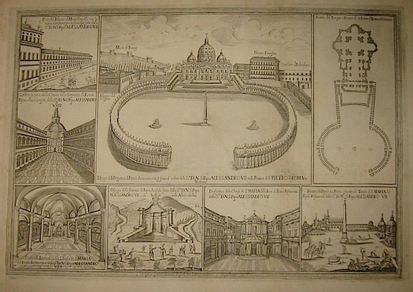Incisione originale su rame (cm. 51x35 più margini) pubblicata da Gio. Battista De Rossi. Piegatura abilmente restaurata ma bell’esemplare, assai fresco. Molto rara. La stampa raffigura, oltre alla nuova sistemazione del porticato di San Pietro ad opera (tra il 1656 ed il 1667) di Gian Lorenzo Bernini, le altre realizzazioni avvenute durante il pontificato di Alessandro VII. Cfr. AA.VV., Indice delle stampe De Rossi, 1996 (p. 194).