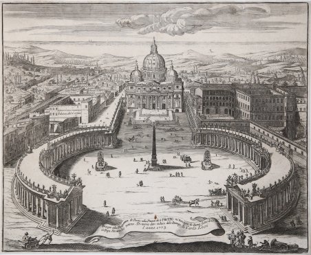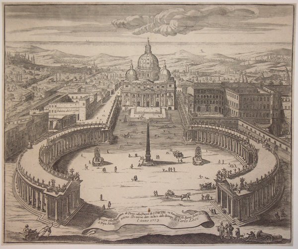 Magnifica e rara veduta in prospettiva di San Pietro, disegnata per mostrare il colonnato del Bernini, di recente costruzione sotto il pontificato di Alessandro VII. Si tratta di una replica edita dalla tipografia di Matteo Gregorio De Rossi, dell’incisione che Giovanni Battista Falda incide per la tipografia rivale del cugino Giovani Giacomo De Rossi. ' Opera anonima, reca l’imprint di Matteo Gregorio e la data 1685. La lastra potrebbe essere incisa da Matteo Gregorio stesso, come pure da Pietro Paolo Girelli o Tiburzio Vergelli, principali collaboratori della tipografia con insegna a Piazza Navona. Per motivi stilistici crediamo che l’attribuzione al Girelli sia l’opzione più verosimile, mentre è molto lontana dallo stile del Vergelli. Matteo Gregorio De Rossi è esponente di uno dei rami della celebre tipografia romana. Verso la fine del XVI secolo inizia l’attività editoriale di Antonio De Rossi, il quale con i figli Giuseppe (il “vecchio”) e Giulio, fonda la stamperia che, nel corso dei due secoli successivi e attraverso quattro generazioni, detenne il monopolio della produzione calcografica della città. La bottega era con insegna De Rossi alla Pace. La storia della famiglia De Rossi è caratterizzata da litigi e contrasti interni che portano all’apertura di singole tipografie in concorrenza tra loro. I figli di Giulio De Rossi, Giuseppe il Giovane e Giovanni Battista, nipoti di Giuseppe De Rossi il Vecchio, avevano fondato nel 1628 una propria bottega sempre nelle vicinanze - All'angolo di via di Parione e via della Pace vicino nei pressi della chiesa S. Biagio della Fossa - ma nel 1635 Giovanni Battista si separò a sua volta dal fratello e aprì una bottega in piazza Navona, la terza quindi della famiglia che venne chiamata a piazza Navona. Nel 1644 dopo la morte di Giuseppe il Giovane suo fratello Giovanni Battista diventò il concorrente più diretto della bottega dello zio, la De Rossi alla Pace, ormai gestita dalla vedova di lui insieme ai figli che allora erano in parte ancora minorenni. Il figlio di Giovanni Battista, Matteo Gregorio De Rossi, proseguì l’attività editoriale paterna, dedicandosi con successo anche all’attività di incisore. Principale collaboratore della tipografia di Giovanni Battista e Matteo Gregorio fu un grande artista del calibro di Lievin Cruyl, che si avvalse della tipografia per la traduzione a stampa di molti suoi disegni su Roma. Matteo Gregorio, in costante rivalità con il cugino Giovanni Giacomo (1627-1691) della tipografia alla Pace, fece intagliare da Tiburzio Vergelli una raccolta sui principali monumenti di Roma ispirata – se non copiata – da Giovan Battista Falda. Magnifica prova, impressa su carta vergata coeva, con margini, in perfetto stato di conservazione. Esemplare nel secondo stato di due, con l'indirizzo di Carlo Losi. Magnificent and rare perspective view of St. Peter's, designed to show Bernini's colonnade, recently built under the pontificate of Alexander VII. It is a replica published by the printing house of Matteo Gregorio De Rossi, of the work that Giovanni Battista Falda engraved for the rival printing house of his cousin Giovani Giacomo De Rossi. ' Anonymous work, it bears the imprint of Matteo Gregorio and the date 1685. The plate could be engraved by Matteo Gregorio himself, as well as by Pietro Paolo Girelli or Tiburzio Vergelli, the main collaborators of the printing house in Piazza Navona. For stylistic reasons we believe that the attribution to Girelli is the most likely option, while it is very far from the style of Vergelli. Matteo Gregorio De Rossi is an exponent of one of the branches of the famous Roman printing house. Towards the end of the sixteenth century began the editorial activity of Antonio De Rossi, who with his sons Giuseppe the Elder and Giulio, founded the printing house that, over the next two centuries and through four generations, held the monopoly of chalcographic production in the city. The workshop had the sign “De Rossi alla Pace”. The history of the De Rossi family is characterized by internal disputes and contrasts that lead to the opening of individual printing houses in competition with each other. Giulio De Rossi's sons, Giuseppe the Younger and Giovanni Battista, nephews of Giuseppe De Rossi the Elder, had founded in 1628 their own workshop in the vicinity - at the corner of Via di Parione and Via della Pace near the church of S. Biagio della Fossa - but in 1635 Giovanni Battista in turn separated from his brother and opened a workshop in Piazza Navona, the third of the family. In 1644, after the death of Giuseppe the Younger, his brother Giovanni Battista became the most direct competitor of his uncle's workshop, the De Rossi alla Pace, now run by his widow along with their children who were then partly still minors. Giovanni Battista's son, Matteo Gregorio De Rossi, continued his father's publishing activity, dedicating himself with success also to the activity of engraver. The main collaborator of the typography of Giovanni Battista and Matteo Gregorio was a great artist of the caliber of Lievin Cruyl, who used the typography for the translation into print of many of his drawings on Rome. Matteo Gregorio, in constant rivalry with his cousin Giovanni Giacomo (1627-1691) of the printing house alla Pace, had Tiburzio Vergelli carve a collection of the main monuments of Rome inspired - if not copied - by Giovan Battista Falda. Fine impression, printed on contemporary laid paper, with margins, perfect condition. Example of the second state of two, with Carlo Losi’s address. Cfr.