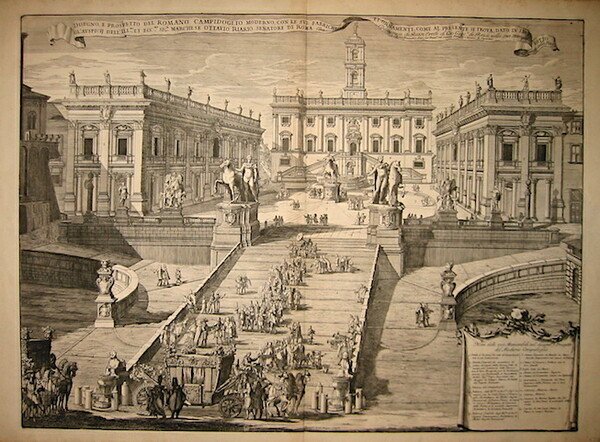 Disegno, e prospetto del romano Campidoglio moderno, con le sue fabriche et ornamenti, come al presente si trova, dato in luce sotto gl’auspicij dell’Ill.mo, et Ecc.mo Sig. Marchese Ottavio Riario senatore di Roma da Domenico de Rossi Erede di Gio. Giac.o de Rossi nella sua stamparia in Roma alla Pace